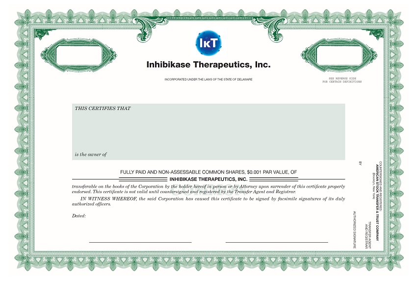 COMMON THIS CERTIFIES THAT is the owner of FULLY PAID AND NON-ASSESSABLE COMMON SHARES, $0.001 PAR VALUE, OF INHIBIKASE THERAPEUTICS, INC. transferable on the books of the Corporation by the holder hereof in person or by Attorney upon surrender of this certificate properly endorsed. This certificate is not valid until countersigned and registered by the Transfer Agent and Registrar.IN WITNESS WHERE OF, the said Corporation has caused this certificate to be signed by facsimile signatures of its duly authorized officers. Dated: Inhibikase Therapeutics, Inc. INCORPORATED UNDER THE LAWS OF THE STATE OF DELAWARE SEE REVERSE SIDE FOR CERTAIN DEFINITIONS COUNTERSIGNED AND REGISTERED: AMERICAN STOCK TRANSFER&TRUST COMPANY (Brooklyn, New York) TRANSFER AGENT AND REGISTRAR BY AUTHORIZED SIGNATURE COMMON THIS CERTIFIES THAT is the owner of FULLY PAID AND NON-ASSESSABLE COMMON SHARES,$0.001 PAR VALUE,OF INHIBIKASE THERAPEUTICS,INC. transferable on the books of the Corporation by the holder here of in person or by Attorney upon surrender of this certificate properly endorsed. This certificate is not valid until countersigned and registered by the Transfer Agent and Registrar.IN WITNESS WHERE OF, the said Corporation has caused this certificate to be signed by facsimile signatures of its duly authorized officers. Dated: Inhibikase Therapeutics, Inc. INCORPORATED UNDER THE LAWS OF THE STATE OF DELAWARE SEE REVERSE SIDE FOR CERTAIN DEFINITIONS COUNTERSIGNED AND REGISTERED: AMERICAN STOCK TRANSFER & TRUST COMPANY (Brooklyn, New York)TRANSFER AGENT AND REGISTRAR BY AUTHORIZED SIGNATURE