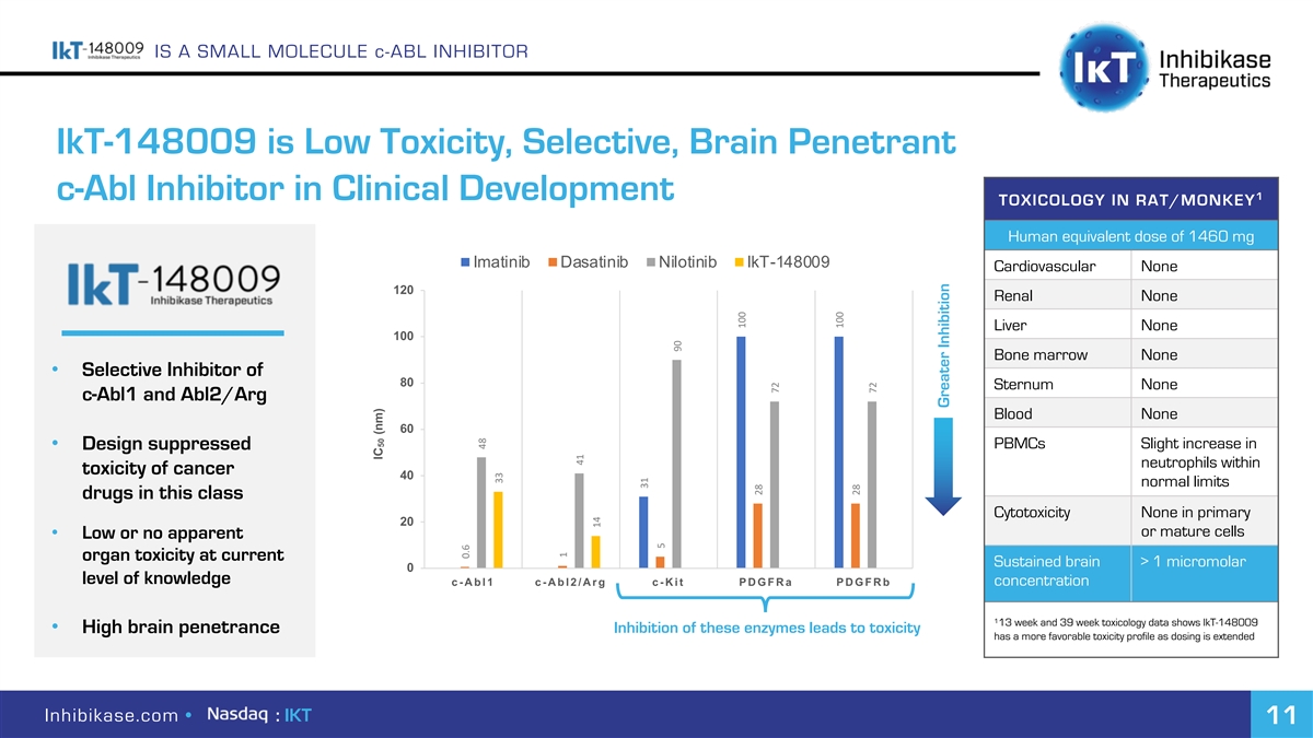 IS A SMALL MOLECULE c-ABL INHIBITOR IkT-148009 is Low Toxicity, Selective, Brain Penetrant 1 c-Abl Inhibitor in Clinical Development TOXICOLOGY IN RAT/MONKEY Human equivalent dose of 1460 mg Imatinib Dasatinib Nilotinib IkT-148009 Cardiovascular None 120 Renal None Liver None 100 Bone marrow None • Selective Inhibitor of 80 Sternum None c-Abl1 and Abl2/Arg Blood None 60 PBMCs Slight increase in • Design suppressed neutrophils within toxicity of cancer 40 normal limits drugs in this class Cytotoxicity None in primary 20 or mature cells • Low or no apparent organ toxicity at current Sustained brain > 1 micromolar 0 level of knowledge c-Abl1 c-Abl2/Arg c-Kit PDGFRa PDGFRb concentration 1 13 week and 39 week toxicology data shows IkT-148009 • High brain penetrance Inhibition of these enzymes leads to toxicity has a more favorable toxicity profile as dosing is extended Inhibikase.com • : IKT 11 IC (nm) 50 0.6 48 33 1 41 14 31 5 90 100 28 72 100 28 72 Greater Inhibition