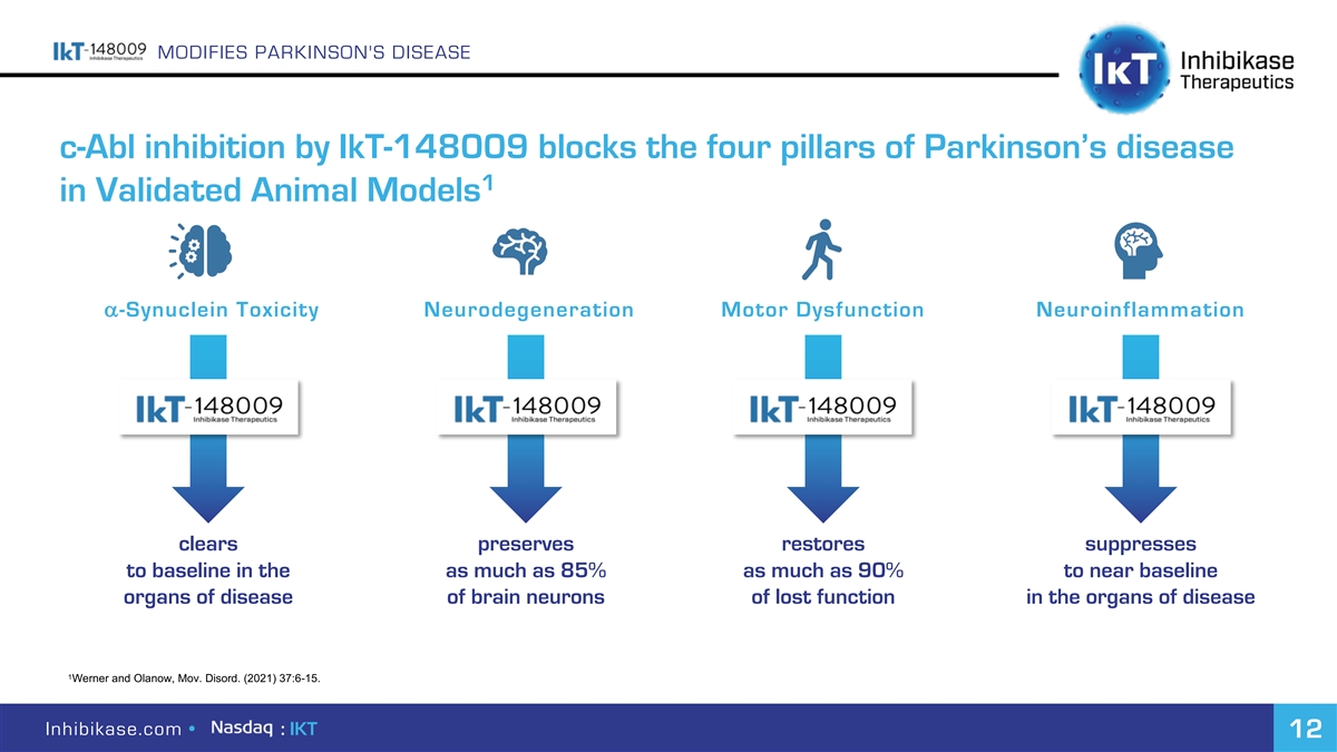 MODIFIES PARKINSON'S DISEASE c-Abl inhibition by IkT-148009 blocks the four pillars of Parkinson’s disease 1 in Validated Animal Models a -Synuclein Toxicity Neurodegeneration Motor Dysfunction Neuroinflammation clears preserves restores suppresses to baseline in the as much as 85% as much as 90% to near baseline organs of disease of brain neurons of lost function in the organs of disease 1 Werner and Olanow, Mov. Disord. (2021) 37:6-15. Inhibikase.com • : IKT 12