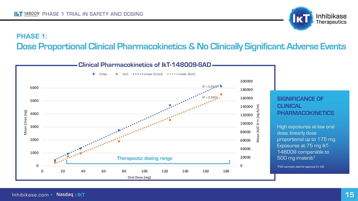 PHASE 1 TRIAL IN SAFETY AND DOSING PHASE 1: Dose Proportional Clinical Pharmacokinetics & No Clinically Significant Adverse Events Clinical Pharmacokinetics of IkT-148009-SAD Cmax AUC Linear (Cmax) Linear (AUC) 200000 R² = 0.9977 6000 180000 R² = 0.9905 160000 SIGNIFICANCE OF 5000 140000 CLINICAL 4000 PHARMACOKINETICS 120000 100000 3000 High exposures at low oral 80000 dose; linearly dose 2000 proportional up to 175 mg. 60000 Exposures at 75 mg IkT- 40000 148009 comparable to 1000 1 20000 500 mg imatinib Therapeutic dosing range 1 0 0 FDA summary data for approval 21-335 0 20 40 60 80 100 120 140 160 180 Oral Dose (mg) Inhibikase.com • : IKT 15 Mean Cmax (ng) Mean AUC 0-∞ (ng-h/mL