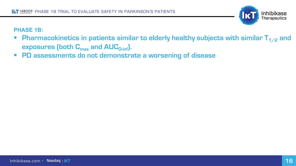 PHASE 1B TRIAL TO EVALUATE SAFETY IN PARKINSON'S PATIENTS PHASE 1B: § Pharmacokinetics in patients similar to elderly healthy subjects with similar T and 1/2 exposures (both C and AUC ). max 0-inf § PD assessments do not demonstrate a worsening of disease Inhibikase.com • : IKT 16