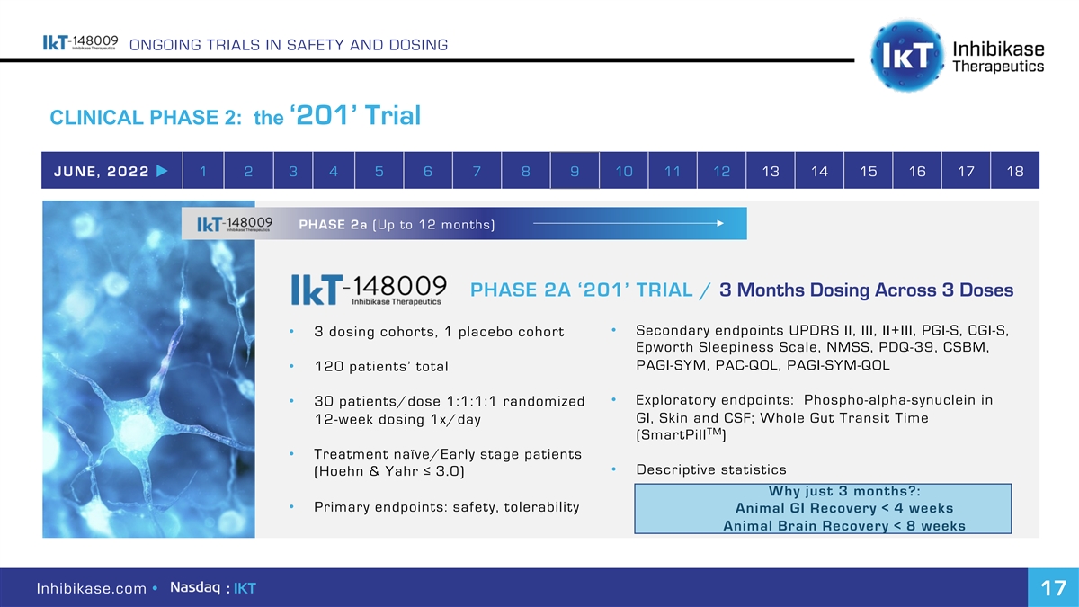 ONGOING TRIALS IN SAFETY AND DOSING CLINICAL PHASE 2: the ‘201’ Trial JUNE, 2022 u 1 2 3 4 5 6 7 8 9 10 11 12 13 14 15 16 17 18 PHASE 2a (Up to 12 months) PHASE 2A ‘201’ TRIAL / 3 Months Dosing Across 3 Doses • Secondary endpoints UPDRS II, III, II+III, PGI-S, CGI-S, • 3 dosing cohorts, 1 placebo cohort Epworth Sleepiness Scale, NMSS, PDQ-39, CSBM, PAGI-SYM, PAC-QOL, PAGI-SYM-QOL • 120 patients’ total • Exploratory endpoints: Phospho-alpha-synuclein in • 30 patients/dose 1:1:1:1 randomized GI, Skin and CSF; Whole Gut Transit Time 12-week dosing 1x/day TM (SmartPill ) • Treatment naïve/Early stage patients • Descriptive statistics (Hoehn & Yahr ≤ 3.0) Why just 3 months?: • Primary endpoints: safety, tolerability Animal GI Recovery < 4 weeks Animal Brain Recovery < 8 weeks Inhibikase.com • : IKT 17