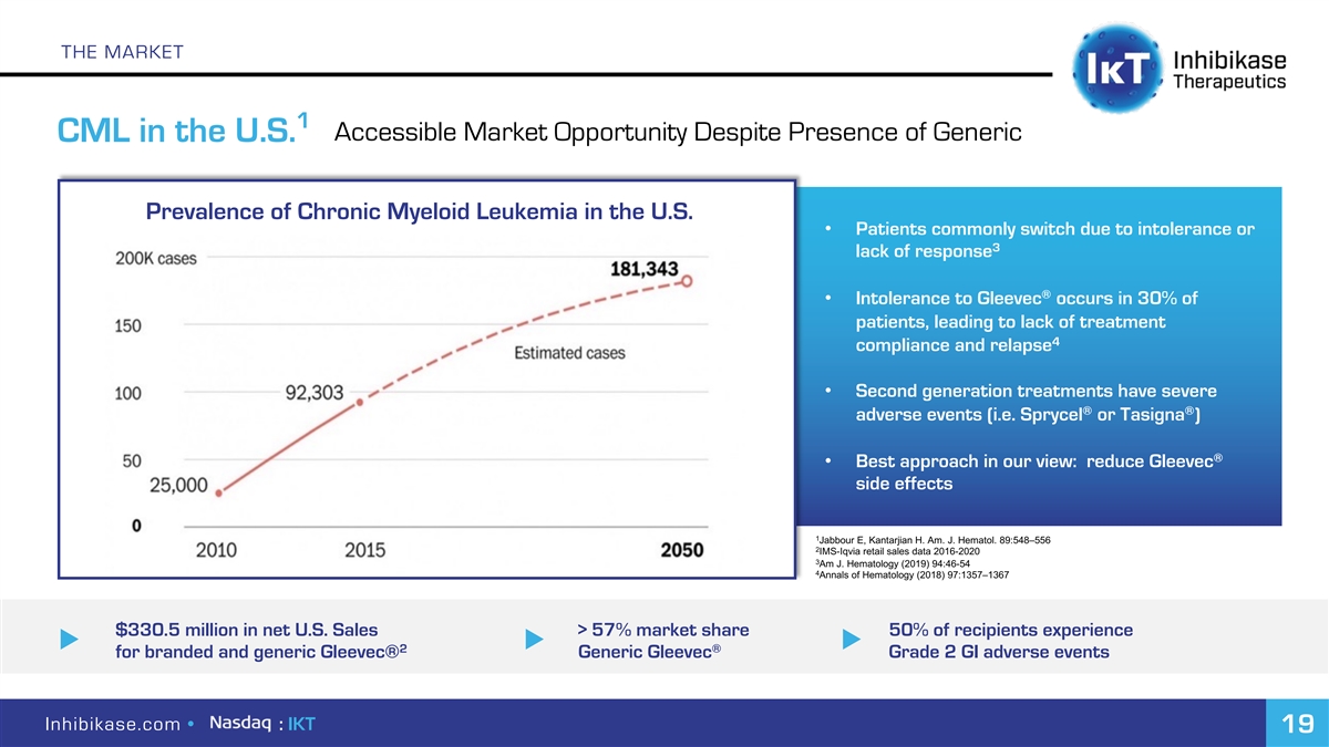 THE MARKET 1 Accessible Market Opportunity Despite Presence of Generic CML in the U.S. Prevalence of Chronic Myeloid Leukemia in the U.S. • Patients commonly switch due to intolerance or 3 lack of response ® • Intolerance to Gleevec occurs in 30% of patients, leading to lack of treatment 4 compliance and relapse • Second generation treatments have severe ® ® adverse events (i.e. Sprycel or Tasigna ) ® • Best approach in our view: reduce Gleevec side effects 1 Jabbour E, Kantarjian H. Am. J. Hematol. 89:548–556 2 IMS-Iqvia retail sales data 2016-2020 3 Am J. Hematology (2019) 94:46-54 4 Annals of Hematology (2018) 97:1357–1367 $330.5 million in net U.S. Sales > 57% market share 50% of recipients experience u u u 2 ® for branded and generic Gleevec® Generic Gleevec Grade 2 GI adverse events Inhibikase.com • : IKT 19