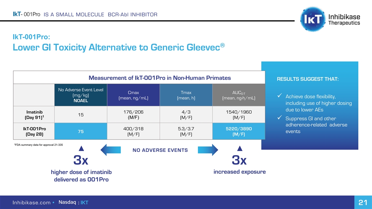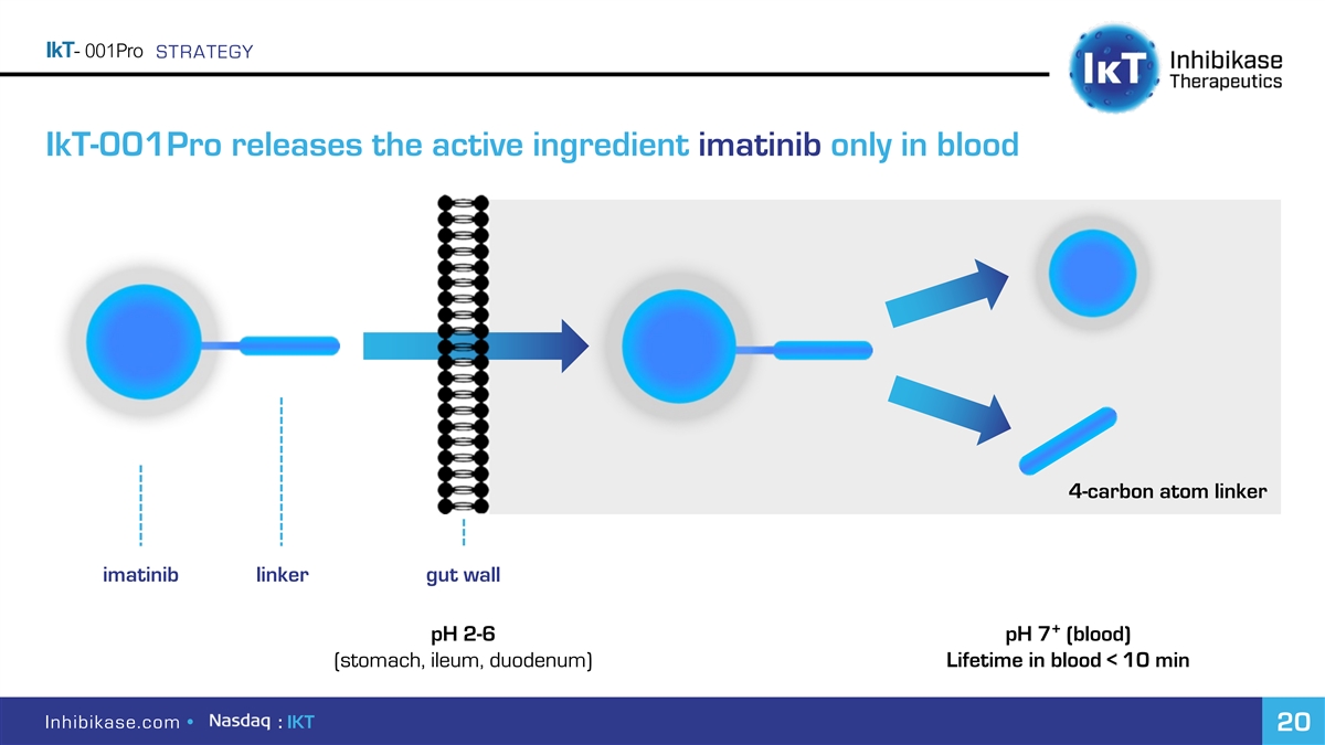 IkT- 001Pro STRATEGY IkT-001Pro releases the active ingredient imatinib only in blood 4-carbon atom linker imatinib linker gut wall + pH 2-6 pH 7 (blood) (stomach, ileum, duodenum) Lifetime in blood < 10 min Inhibikase.com • : IKT 20