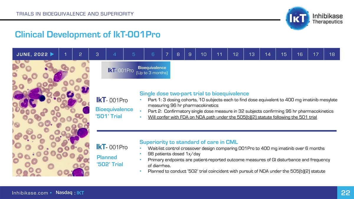 TRIALS IN BIOEQUIVALENCE AND SUPERIORITY Clinical Development of IkT-001Pro JUNE, 2022 u 1 2 3 4 5 6 7 8 9 10 11 12 13 14 15 16 17 18 Bioequivalence IkT- 001Pro (Up to 3 months) Single dose two-part trial to bioequivalence • Part 1: 3 dosing cohorts, 10 subjects each to find dose equivalent to 400 mg imatinib mesylate IkT- 001Pro measuring 96 hr pharmacokinetics Bioequivalence • Part 2: Confirmatory single dose measure in 32 subjects confirming 96 hr pharmacokinetics ‘501’ Trial • Will confer with FDA on NDA path under the 505(b)(2) statute following the 501 trial Superiority to standard of care in CML IkT- 001Pro • Wait-list control crossover design comparing 001Pro to 400 mg imatinib over 6 months • 98 patients dosed 1x/day Planned • Primary endpoints are patient-reported outcome measures of GI disturbance and frequency ‘502’ Trial of diarrhea. • Planned to conduct ‘502’ trial coincident with pursuit of NDA under the 505(b)(2) statute Inhibikase.com • : IKT 22