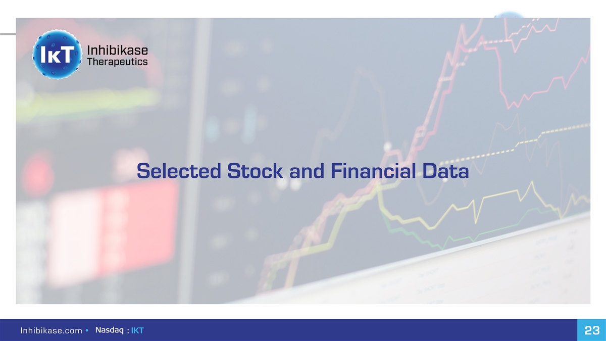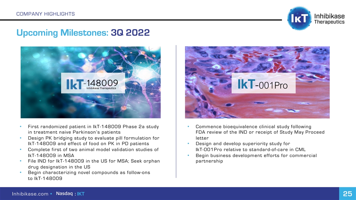 COMPANY HIGHLIGHTS Upcoming Milestones: 3Q 2022 IkT-001Pro • First randomized patient in IkT-148009 Phase 2a study • Commence bioequivalence clinical study following in treatment naive Parkinson’s patients FDA review of the IND or receipt of Study May Proceed • Design PK bridging study to evaluate pill formulation for letter IkT-148009 and effect of food on PK in PD patients • Design and develop superiority study for • Complete first of two animal model validation studies of IkT-001Pro relative to standard-of-care in CML IkT-148009 in MSA • Begin business development efforts for commercial • File IND for IkT-148009 in the US for MSA; Seek orphan partnership drug designation in the US • Begin characterizing novel compounds as follow-ons to IkT-148009 Inhibikase.com • : IKT 25
