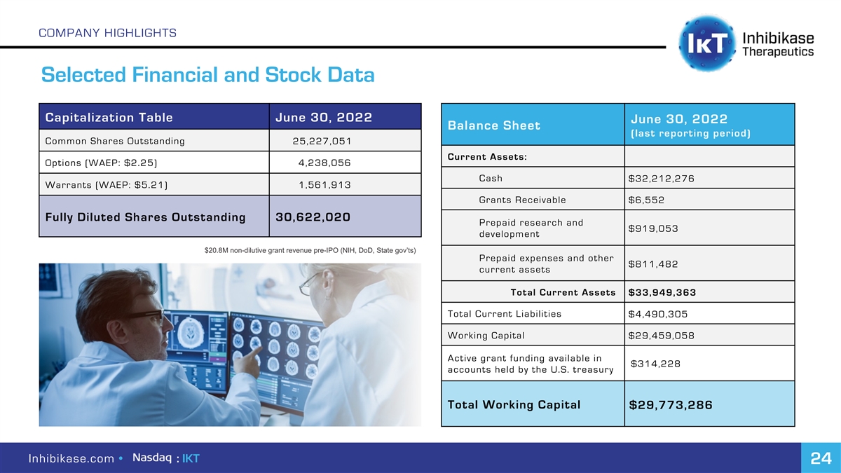 COMPANY HIGHLIGHTS Selected Financial and Stock Data Capitalization Table June 30, 2022 June 30, 2022 Balance Sheet (last reporting period) Common Shares Outstanding 25,227,051 Current Assets: Options (WAEP: $2.25) 4,238,056 Cash $32,212,276 Warrants (WAEP: $5.21) 1,561,913 Grants Receivable $6,552 Fully Diluted Shares Outstanding 30,622,020 Prepaid research and $919,053 development $20.8M non-dilutive grant revenue pre-IPO (NIH, DoD, State gov’ts) Prepaid expenses and other $811,482 current assets Total Current Assets $33,949,363 Total Current Liabilities $4,490,305 Working Capital $29,459,058 Active grant funding available in $314,228 accounts held by the U.S. treasury Total Working Capital $29,773,286 Inhibikase.com • : IKT 24