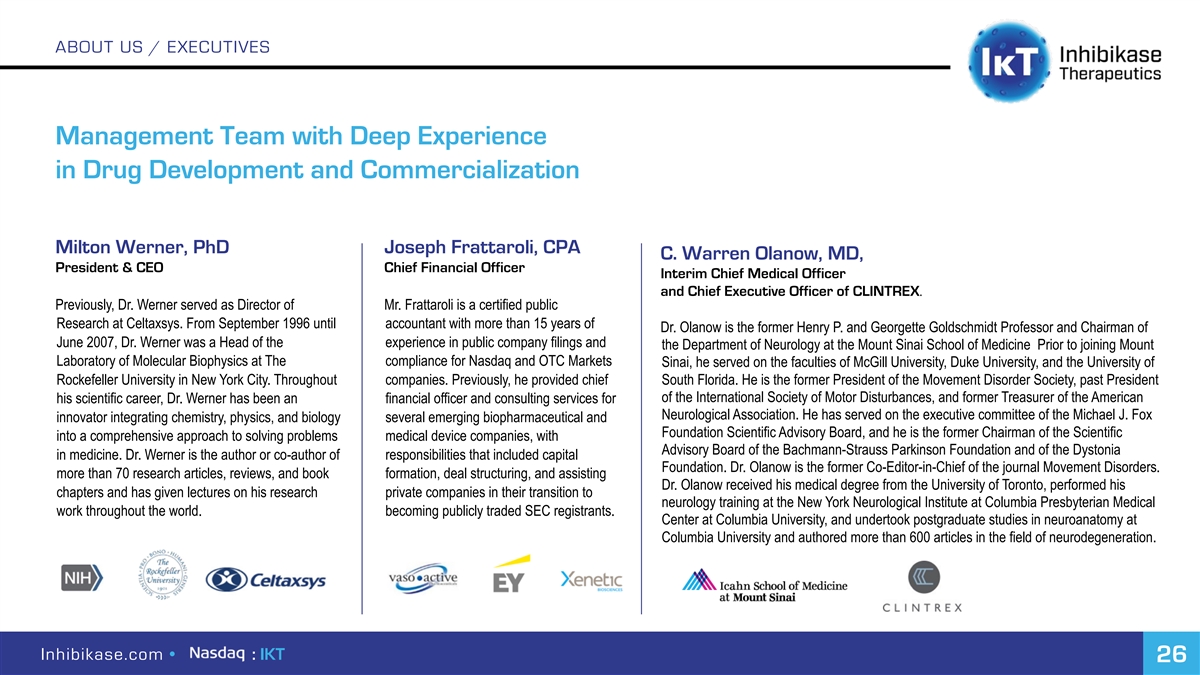 ABOUT US / EXECUTIVES Management Team with Deep Experience in Drug Development and Commercialization Milton Werner, PhD Joseph Frattaroli, CPA C. Warren Olanow, MD, President & CEO Chief Financial Officer Interim Chief Medical Officer and Chief Executive Officer of CLINTREX. Previously, Dr. Werner served as Director of Mr. Frattaroli is a certified public Research at Celtaxsys. From September 1996 until accountant with more than 15 years of Dr. Olanow is the former Henry P. and Georgette Goldschmidt Professor and Chairman of June 2007, Dr. Werner was a Head of the experience in public company filings and the Department of Neurology at the Mount Sinai School of Medicine Prior to joining Mount Laboratory of Molecular Biophysics at The compliance for Nasdaq and OTC Markets Sinai, he served on the faculties of McGill University, Duke University, and the University of Rockefeller University in New York City. Throughout companies. Previously, he provided chief South Florida. He is the former President of the Movement Disorder Society, past President of the International Society of Motor Disturbances, and former Treasurer of the American his scientific career, Dr. Werner has been an financial officer and consulting services for Neurological Association. He has served on the executive committee of the Michael J. Fox innovator integrating chemistry, physics, and biology several emerging biopharmaceutical and Foundation Scientific Advisory Board, and he is the former Chairman of the Scientific into a comprehensive approach to solving problems medical device companies, with Advisory Board of the Bachmann-Strauss Parkinson Foundation and of the Dystonia in medicine. Dr. Werner is the author or co-author of responsibilities that included capital Foundation. Dr. Olanow is the former Co-Editor-in-Chief of the journal Movement Disorders. more than 70 research articles, reviews, and book formation, deal structuring, and assisting Dr. Olanow received his medical degree from the University of Toronto, performed his chapters and has given lectures on his research private companies in their transition to neurology training at the New York Neurological Institute at Columbia Presbyterian Medical work throughout the world. becoming publicly traded SEC registrants. Center at Columbia University, and undertook postgraduate studies in neuroanatomy at Columbia University and authored more than 600 articles in the field of neurodegeneration. Inhibikase.com • : IKT 26