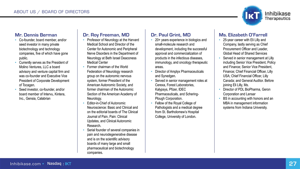 ABOUT US / BOARD OF DIRECTORS Mr. Dennis Berman Dr. Roy Freeman, MD Dr. Paul Grint, MD Ms. Elizabeth O’Farrell • Co-founder, board member, and/or • Professor of Neurology at the Harvard • 20+ years experience in biologics and • 25-year career with Eli Lilly and seed investor in many private Medical School and Director of the small-molecule research and Company, lastly serving as Chief biotechnology and technology Center for Autonomic and Peripheral development, including the successful Procurement Officer and Leader, companies, five of which have gone Nerve Disorders in the Department of approval and commercialization of Global Head of Shared Services public. Neurology at Beth Israel Deaconess products in the infectious diseases, • Served in senior management at Lilly • Currently serves as the President of Medical Center immunology, and oncology therapeutic including Senior Vice President, Policy Molino Ventures, LLC a board • Former chairman of the World areas. and Finance; Senior Vice President, advisory and venture capital firm and Federation of Neurology research • Director of Amplyx Pharmaceuticals Finance; Chief Financial Officer, Lilly was co-founder and Executive Vice group on the autonomic nervous and Synedgen. USA; Chief Financial Officer, Lilly President of Corporate Development system, former President of the • Served in senior management roles at Canada; and General Auditor. Before of Tocagen. American Autonomic Society, and Cerexa, Forest Laboratories, joining Eli Lilly, Ms. • Seed investor, co-founder, and/or former chairman of the Autonomic Kalypsys, Pfizer, IDEC • Director of PDL BioPharma, Geron board member of Intervu, Kintera, Section of the American Academy of Pharmaceuticals, and Schering- Corporation and Lensar Inc., Gensia, Calabrian Neurology. Plough Corporation. • BS in accounting with honors and an • Editor-in-Chief of Autonomic • Fellow of the Royal College of MBA in management information Neuroscience: Basic and Clinical and Pathologists and a medical degree systems from Indiana University. on the editorial boards of The Clinical from St. Bartholomew’s Hospital Journal of Pain, Pain: Clinical College, University of London. Updates, and Clinical Autonomic Research. • Serial founder of several companies in pain and neurodegenerative disease and is on the scientific advisory boards of many large and small pharmaceutical and biotechnology companies. Inhibikase.com • : IKT 27
