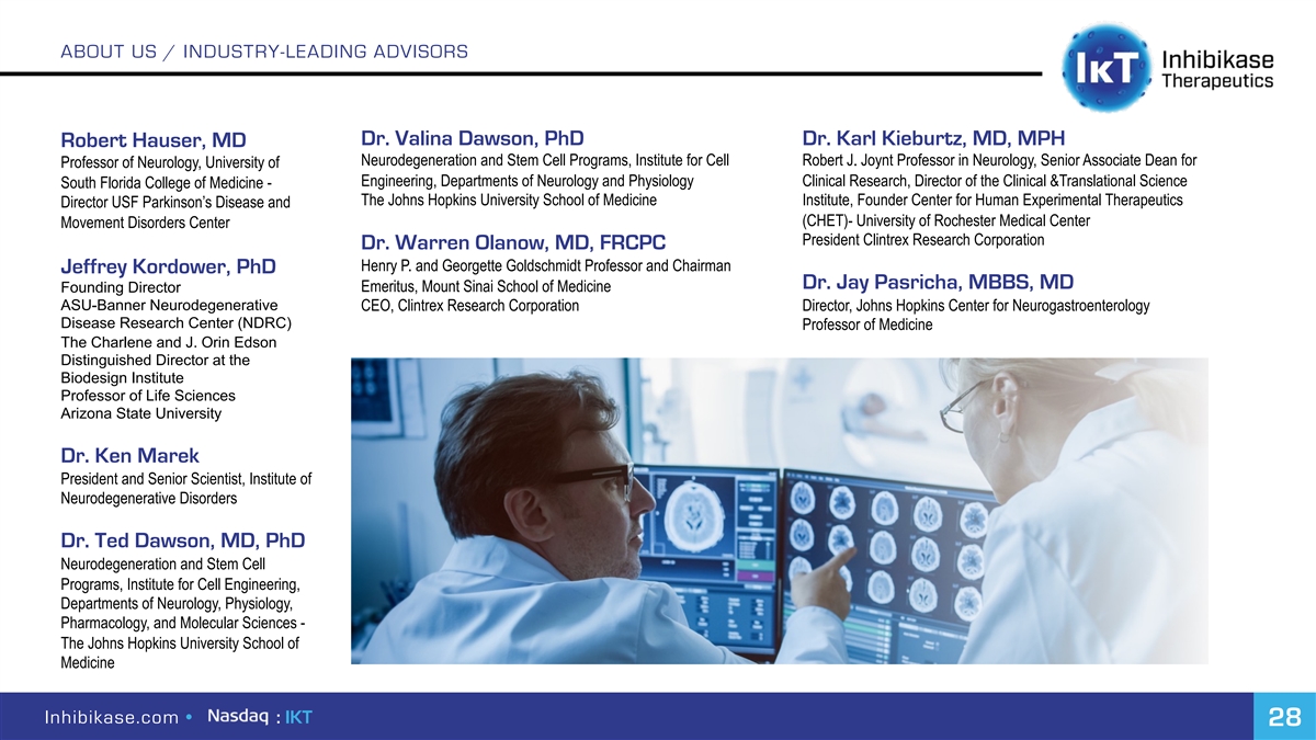 ABOUT US / INDUSTRY-LEADING ADVISORS Dr. Valina Dawson, PhD Dr. Karl Kieburtz, MD, MPH Robert Hauser, MD Neurodegeneration and Stem Cell Programs, Institute for Cell Robert J. Joynt Professor in Neurology, Senior Associate Dean for Professor of Neurology, University of Engineering, Departments of Neurology and Physiology Clinical Research, Director of the Clinical &Translational Science South Florida College of Medicine - The Johns Hopkins University School of Medicine Institute, Founder Center for Human Experimental Therapeutics Director USF Parkinson’s Disease and (CHET)- University of Rochester Medical Center Movement Disorders Center President Clintrex Research Corporation Dr. Warren Olanow, MD, FRCPC Henry P. and Georgette Goldschmidt Professor and Chairman Jeffrey Kordower, PhD Dr. Jay Pasricha, MBBS, MD Emeritus, Mount Sinai School of Medicine Founding Director ASU-Banner Neurodegenerative CEO, Clintrex Research Corporation Director, Johns Hopkins Center for Neurogastroenterology Disease Research Center (NDRC) Professor of Medicine The Charlene and J. Orin Edson Distinguished Director at the Biodesign Institute Professor of Life Sciences Arizona State University Dr. Ken Marek President and Senior Scientist, Institute of Neurodegenerative Disorders Dr. Ted Dawson, MD, PhD Neurodegeneration and Stem Cell Programs, Institute for Cell Engineering, Departments of Neurology, Physiology, Pharmacology, and Molecular Sciences - The Johns Hopkins University School of Medicine Inhibikase.com • : IKT 28