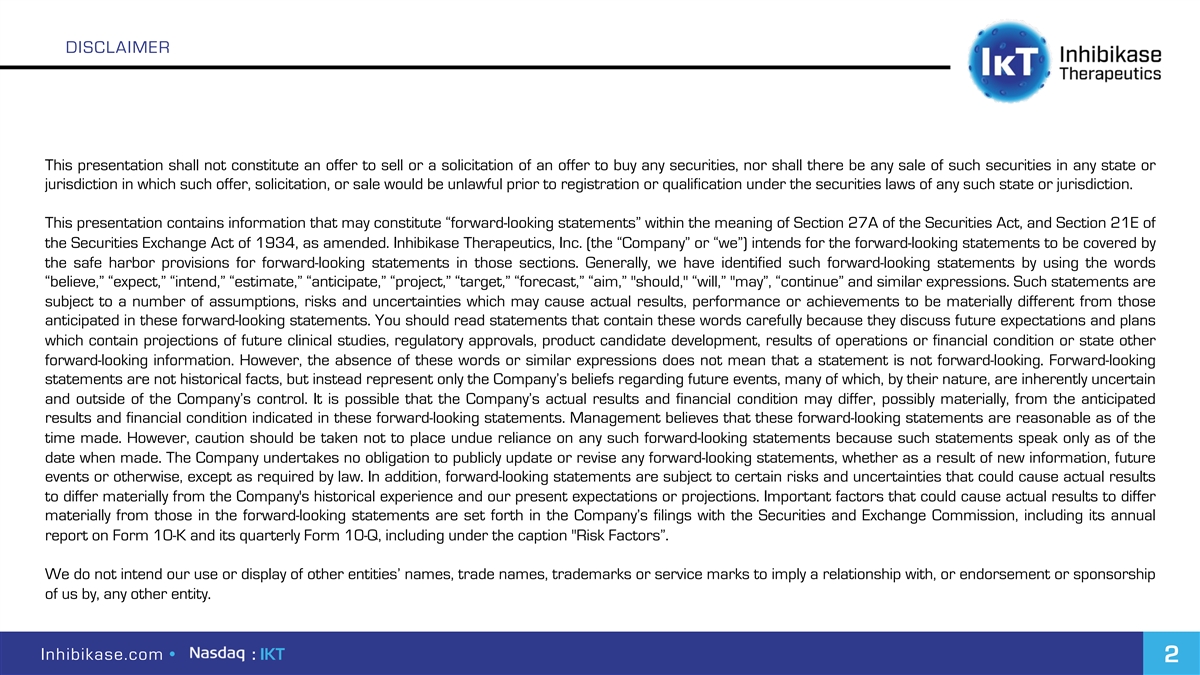 DISCLAIMER This presentation shall not constitute an offer to sell or a solicitation of an offer to buy any securities, nor shall there be any sale of such securities in any state or jurisdiction in which such offer, solicitation, or sale would be unlawful prior to registration or qualification under the securities laws of any such state or jurisdiction. This presentation contains information that may constitute “forward-looking statements” within the meaning of Section 27A of the Securities Act, and Section 21E of the Securities Exchange Act of 1934, as amended. Inhibikase Therapeutics, Inc. (the “Company” or “we”) intends for the forward-looking statements to be covered by the safe harbor provisions for forward-looking statements in those sections. Generally, we have identified such forward-looking statements by using the words “believe,” “expect,” “intend,” “estimate,” “anticipate,” “project,” “target,” “forecast,” “aim,” should, “will,” may”, “continue” and similar expressions. Such statements are subject to a number of assumptions, risks and uncertainties which may cause actual results, performance or achievements to be materially different from those anticipated in these forward-looking statements. You should read statements that contain these words carefully because they discuss future expectations and plans which contain projections of future clinical studies, regulatory approvals, product candidate development, results of operations or financial condition or state other forward-looking information. However, the absence of these words or similar expressions does not mean that a statement is not forward-looking. Forward-looking statements are not historical facts, but instead represent only the Company’s beliefs regarding future events, many of which, by their nature, are inherently uncertain and outside of the Company’s control. It is possible that the Company’s actual results and financial condition may differ, possibly materially, from the anticipated results and financial condition indicated in these forward-looking statements. Management believes that these forward-looking statements are reasonable as of the time made. However, caution should be taken not to place undue reliance on any such forward-looking statements because such statements speak only as of the date when made. The Company undertakes no obligation to publicly update or revise any forward-looking statements, whether as a result of new information, future events or otherwise, except as required by law. In addition, forward-looking statements are subject to certain risks and uncertainties that could cause actual results to differ materially from the Company's historical experience and our present expectations or projections. Important factors that could cause actual results to differ materially from those in the forward-looking statements are set forth in the Company’s filings with the Securities and Exchange Commission, including its annual report on Form 10-K and its quarterly Form 10-Q, including under the caption Risk Factors”. We do not intend our use or display of other entities’ names, trade names, trademarks or service marks to imply a relationship with, or endorsement or sponsorship of us by, any other entity. Inhibikase.com • : IKT 2