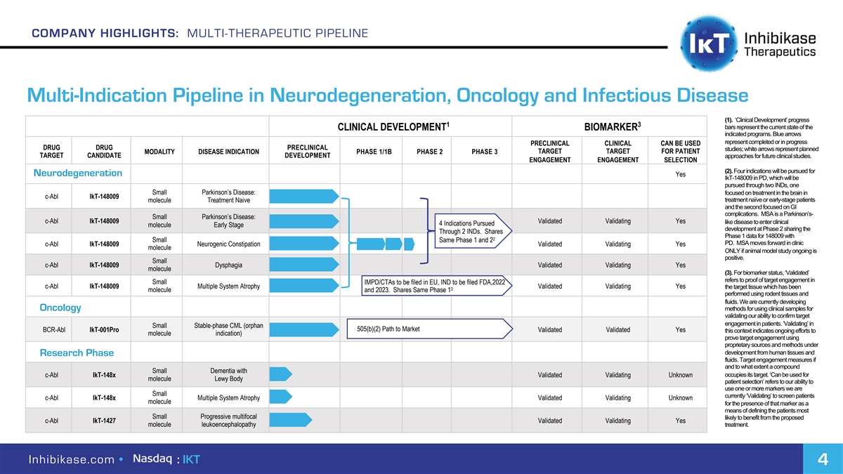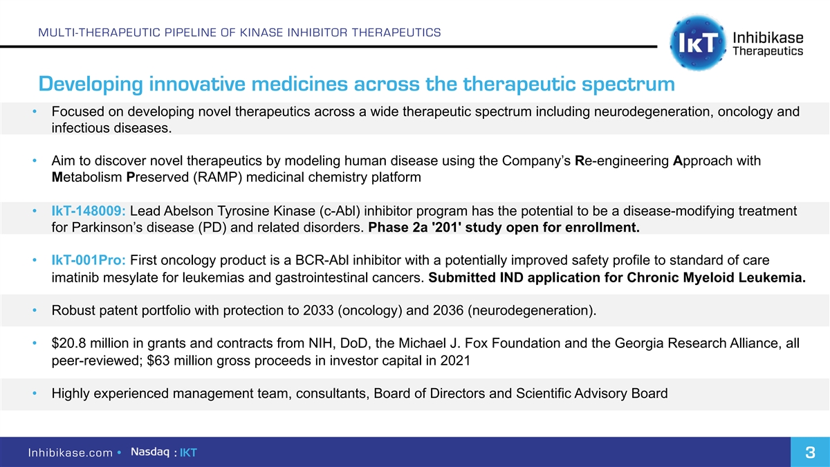 MULTI-THERAPEUTIC PIPELINE OF KINASE INHIBITOR THERAPEUTICS Developing innovative medicines across the therapeutic spectrum • Focused on developing novel therapeutics across a wide therapeutic spectrum including neurodegeneration, oncology and infectious diseases. • Aim to discover novel therapeutics by modeling human disease using the Company’s Re-engineering Approach with Metabolism Preserved (RAMP) medicinal chemistry platform • IkT-148009: Lead Abelson Tyrosine Kinase (c-Abl) inhibitor program has the potential to be a disease-modifying treatment for Parkinson’s disease (PD) and related disorders. Phase 2a '201' study open for enrollment. • IkT-001Pro: First oncology product is a BCR-Abl inhibitor with a potentially improved safety profile to standard of care imatinib mesylate for leukemias and gastrointestinal cancers. Submitted IND application for Chronic Myeloid Leukemia. • Robust patent portfolio with protection to 2033 (oncology) and 2036 (neurodegeneration). • $20.8 million in grants and contracts from NIH, DoD, the Michael J. Fox Foundation and the Georgia Research Alliance, all peer-reviewed; $63 million gross proceeds in investor capital in 2021 • Highly experienced management team, consultants, Board of Directors and Scientific Advisory Board Inhibikase.com • : IKT 3