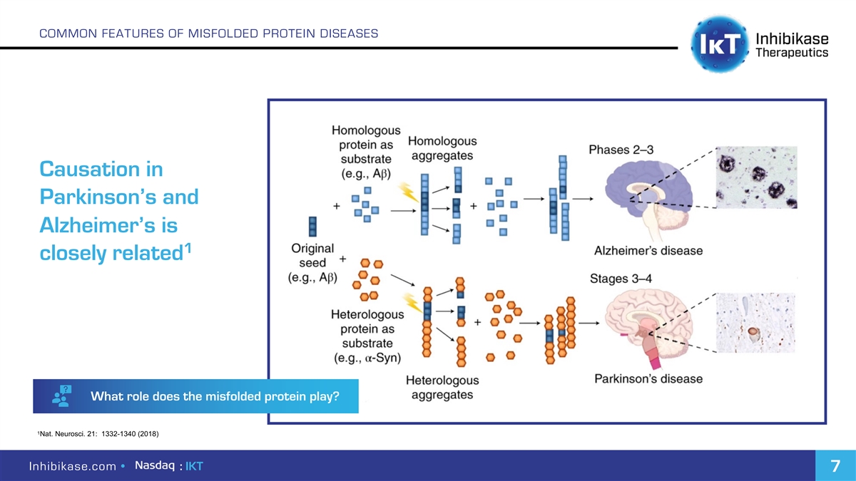 COMMON FEATURES OF MISFOLDED PROTEIN DISEASES Causation in Parkinson’s and Alzheimer’s is 1 closely related What role does the misfolded protein play? 1 Nat. Neurosci. 21: 1332-1340 (2018) Inhibikase.com • : IKT 7