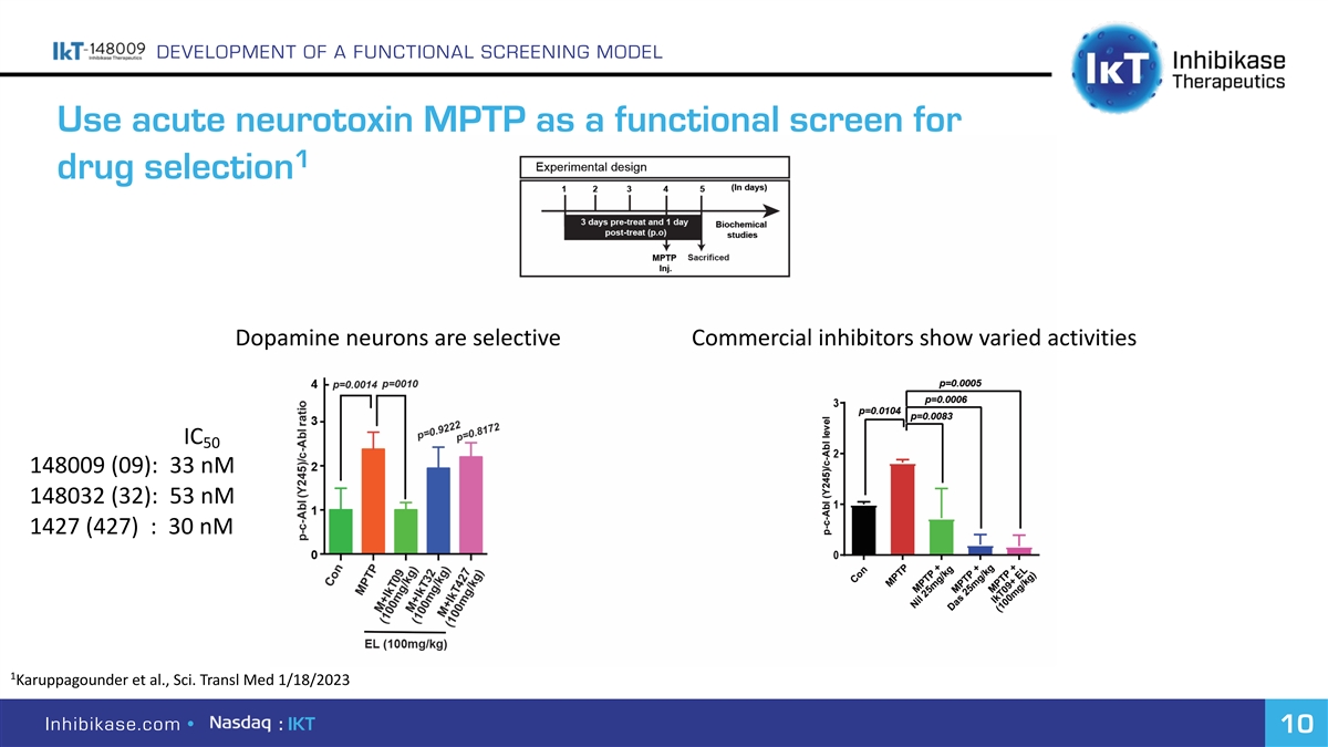 DEVELOPMENT OF A FUNCTIONAL SCREENING MODEL Use acute neurotoxin MPTP as a functional screen for 1 drug selection Dopamine neurons are selective Commercial inhibitors show varied activities IC 50 148009 (09): 33 nM 148032 (32): 53 nM 1427 (427) : 30 nM 1 Karuppagounder et al., Sci. Transl Med 1/18/2023 Inhibikase.com • : IKT 10
