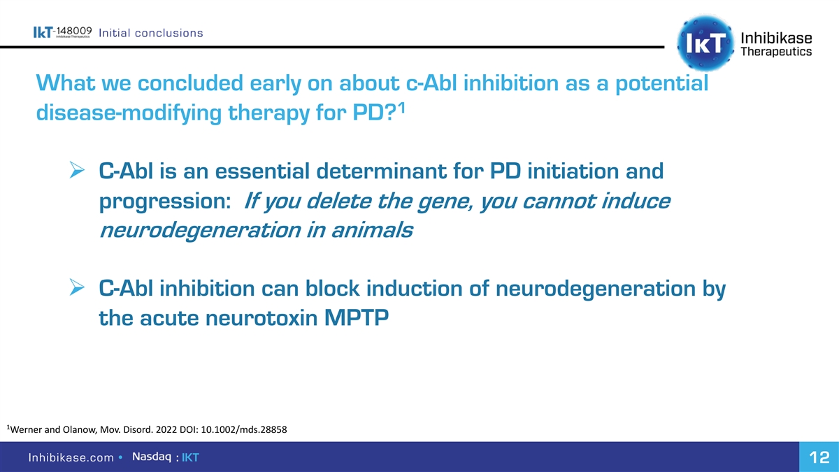 Initial conclusions What we concluded early on about c-Abl inhibition as a potential 1 disease-modifying therapy for PD? Ø C-Abl is an essential determinant for PD initiation and progression: If you delete the gene, you cannot induce neurodegeneration in animals Ø C-Abl inhibition can block induction of neurodegeneration by the acute neurotoxin MPTP 1 Werner and Olanow, Mov. Disord. 2022 DOI: 10.1002/mds.28858 Inhibikase.com • : IKT 12
