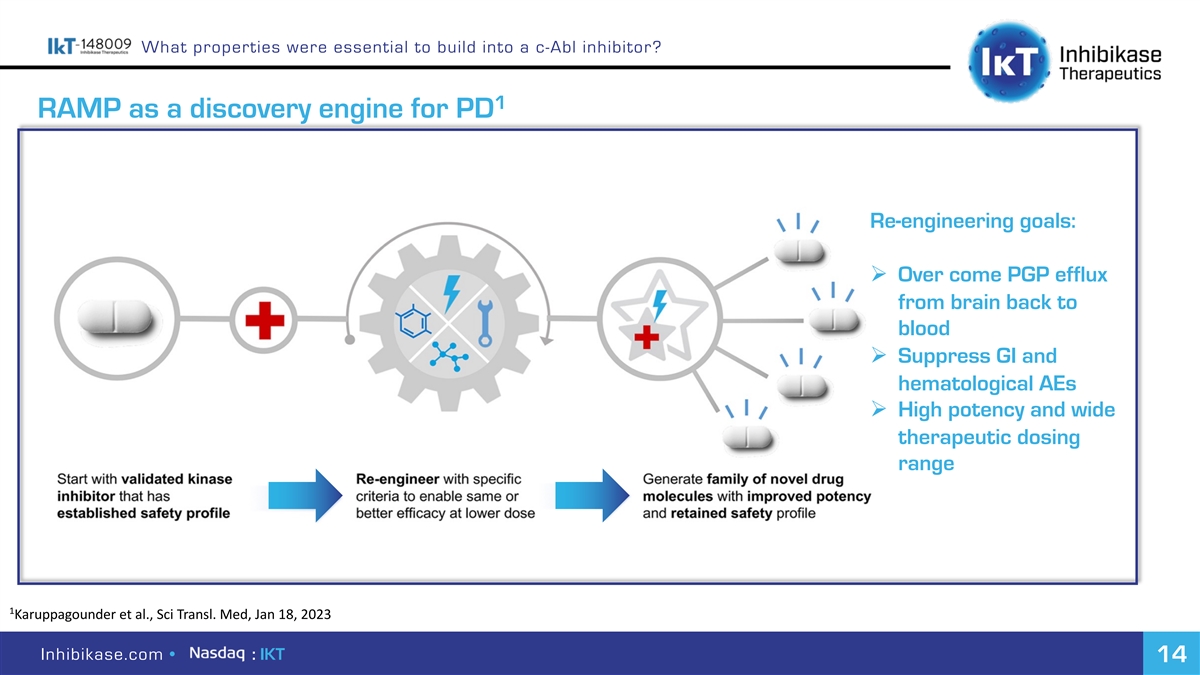 What properties were essential to build into a c-Abl inhibitor? 1 RAMP as a discovery engine for PD Re-engineering goals: Ø Over come PGP efflux from brain back to blood Ø Suppress GI and hematological AEs Ø High potency and wide therapeutic dosing range 1 Karuppagounder et al., Sci Transl. Med, Jan 18, 2023 Inhibikase.com • : IKT 14
