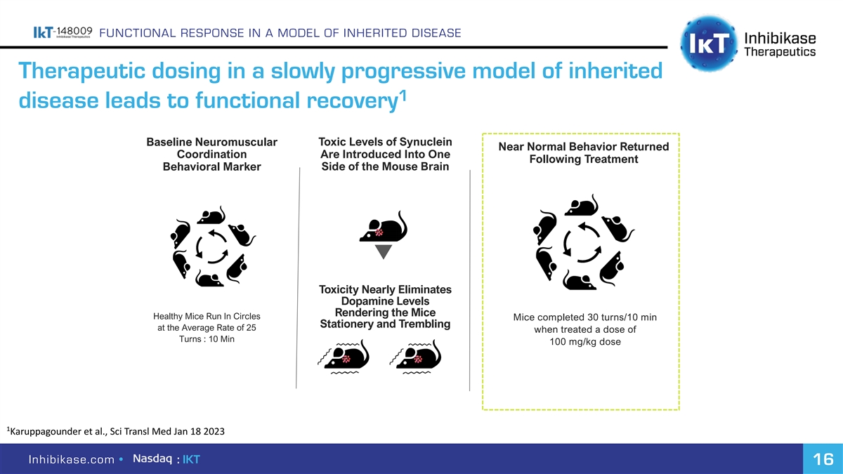 FUNCTIONAL RESPONSE IN A MODEL OF INHERITED DISEASE Therapeutic dosing in a slowly progressive model of inherited 1 disease leads to functional recovery Baseline Neuromuscular Toxic Levels of Synuclein Near Normal Behavior Returned Coordination Are Introduced Into One Following Treatment Behavioral Marker Side of the Mouse Brain Toxicity Nearly Eliminates Dopamine Levels Rendering the Mice Healthy Mice Run In Circles Mice completed 30 turns/10 min Stationery and Trembling at the Average Rate of 25 when treated a dose of Turns : 10 Min 100 mg/kg dose 1 Karuppagounder et al., Sci Transl Med Jan 18 2023 Inhibikase.com • : IKT 16
