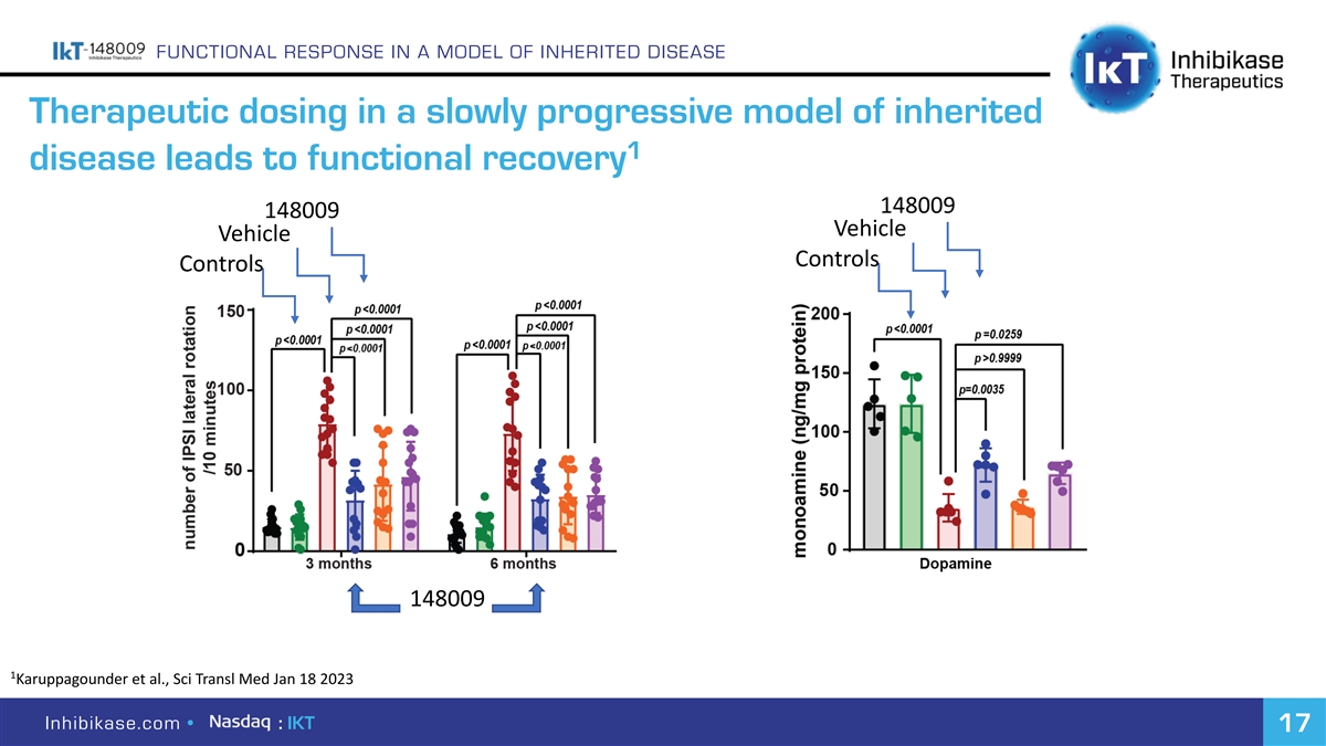FUNCTIONAL RESPONSE IN A MODEL OF INHERITED DISEASE Therapeutic dosing in a slowly progressive model of inherited 1 disease leads to functional recovery 148009 148009 Vehicle Vehicle Controls Controls 148009 1 Karuppagounder et al., Sci Transl Med Jan 18 2023 Inhibikase.com • : IKT 17