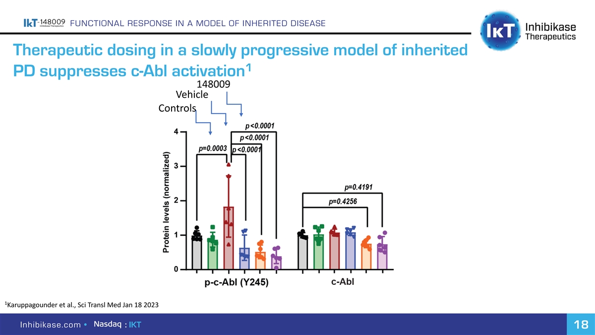 FUNCTIONAL RESPONSE IN A MODEL OF INHERITED DISEASE Therapeutic dosing in a slowly progressive model of inherited 1 PD suppresses c-Abl activation 148009 Vehicle Controls 1 Karuppagounder et al., Sci Transl Med Jan 18 2023 Inhibikase.com • : IKT 18