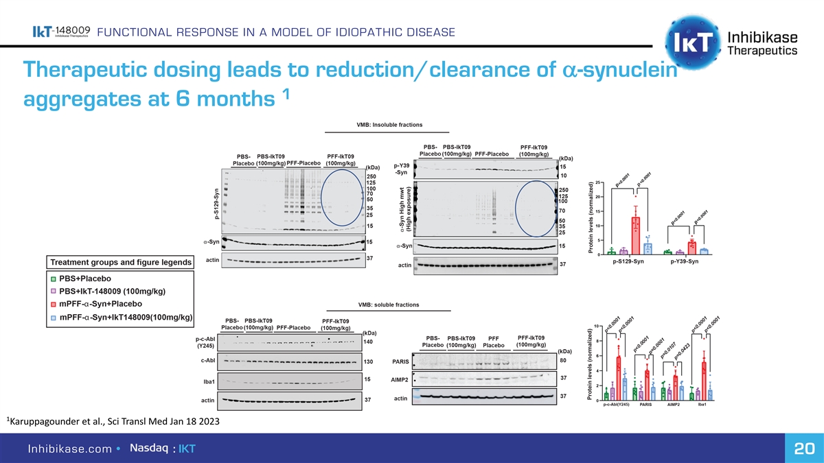 FUNCTIONAL RESPONSE IN A MODEL OF IDIOPATHIC DISEASE a Therapeutic dosing leads to reduction/clearance of -synuclein 1 aggregates at 6 months 1 Karuppagounder et al., Sci Transl Med Jan 18 2023 Inhibikase.com • : IKT 20