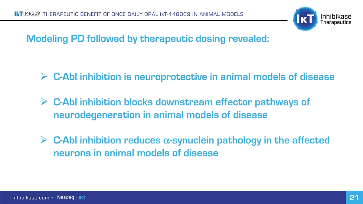 THERAPEUTIC BENEFIT OF ONCE DAILY ORAL IkT-148009 IN ANIMAL MODELS Modeling PD followed by therapeutic dosing revealed: Ø C-Abl inhibition is neuroprotective in animal models of disease Ø C-Abl inhibition blocks downstream effector pathways of neurodegeneration in animal models of disease Ø C-Abl inhibition reduces a-synuclein pathology in the affected neurons in animal models of disease Inhibikase.com • : IKT 21