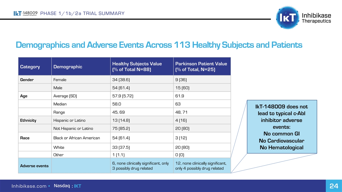 PHASE 1/1b/2a TRIAL SUMMARY Demographics and Adverse Events Across 113 Healthy Subjects and Patients Healthy Subjects Value Parkinson Patient Value Category Demographic (% of Total N=88) (% of Total, N=25) Gender Female 34 (38.6) 9 (36) Male 54 (61.4) 15 (60) Age Average (SD) 57.9 (5.72) 61.9 Median 58.0 63 IkT-148009 does not Range 45, 69 48, 71 lead to typical c-Abl Ethnicity Hispanic or Latino 13 (14.8) 4 (16) inhibitor adverse events: Not Hispanic or Latino 75 (85.2) 20 (80) No common GI Race Black or African American 54 (61.4) 3 (12) No Cardiovascular White 33 (37.5) 20 (80) No Hematological Other 1 (1.1) 0 (0) 6, none clinically significant, only 12, none clinically significant, Adverse events 3 possibly drug related only 4 possibly drug related Inhibikase.com • : IKT 24