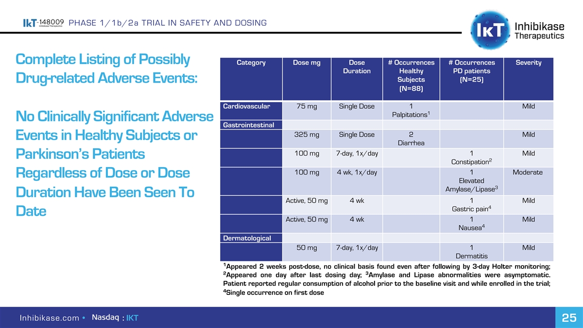 PHASE 1/1b/2a TRIAL IN SAFETY AND DOSING Complete Listing of Possibly Category Dose mg Dose # Occurrences # Occurrences Severity Duration Healthy PD patients Subjects (N=25) Drug-related Adverse Events: (N=88) Cardiovascular 75 mg Single Dose 1 Mild 1 Palpitations No Clinically Significant Adverse Gastrointestinal 325 mg Single Dose 2 Mild Events in Healthy Subjects or Diarrhea 100 mg 7-day, 1x/day 1 Mild Parkinson’s Patients 2 Constipation 100 mg 4 wk, 1x/day 1 Moderate Regardless of Dose or Dose Elevated 3 Amylase/Lipase Duration Have Been Seen To Active, 50 mg 4 wk 1 Mild 4 Gastric pain Date Active, 50 mg 4 wk 1 Mild 4 Nausea Dermatological 50 mg 7-day, 1x/day 1 Mild Dermatitis 1 Appeared 2 weeks post-dose, no clinical basis found even after following by 3-day Holter monitoring; 2 3 Appeared one day after last dosing day; Amylase and Lipase abnormalities were asymptomatic. Patient reported regular consumption of alcohol prior to the baseline visit and while enrolled in the trial; 4 Single occurrence on first dose Inhibikase.com • : IKT 25