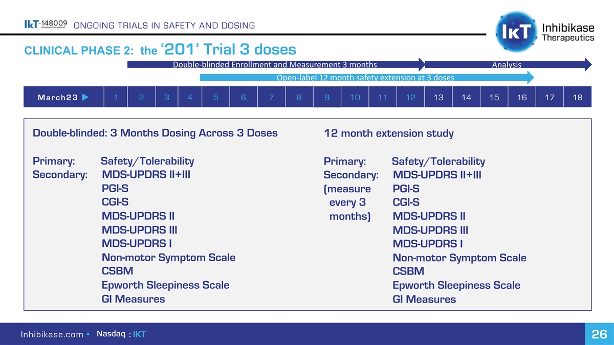 ONGOING TRIALS IN SAFETY AND DOSING CLINICAL PHASE 2: the ‘201’ Trial 3 doses Double-blinded Enrollment and Measurement 3 months Analysis Open-label 12 month safety extension at 3 doses March23 u 1 2 3 4 5 6 7 8 9 10 11 12 13 14 15 16 17 18 Double-blinded: 3 Months Dosing Across 3 Doses 12 month extension study Primary: Safety/Tolerability Primary: Safety/Tolerability Secondary: MDS-UPDRS II+III Secondary: MDS-UPDRS II+III PGI-S (measure PGI-S CGI-S every 3 CGI-S MDS-UPDRS II months) MDS-UPDRS II MDS-UPDRS III MDS-UPDRS III MDS-UPDRS I MDS-UPDRS I Non-motor Symptom Scale Non-motor Symptom Scale CSBM CSBM Epworth Sleepiness Scale Epworth Sleepiness Scale GI Measures GI Measures Inhibikase.com • : IKT 26