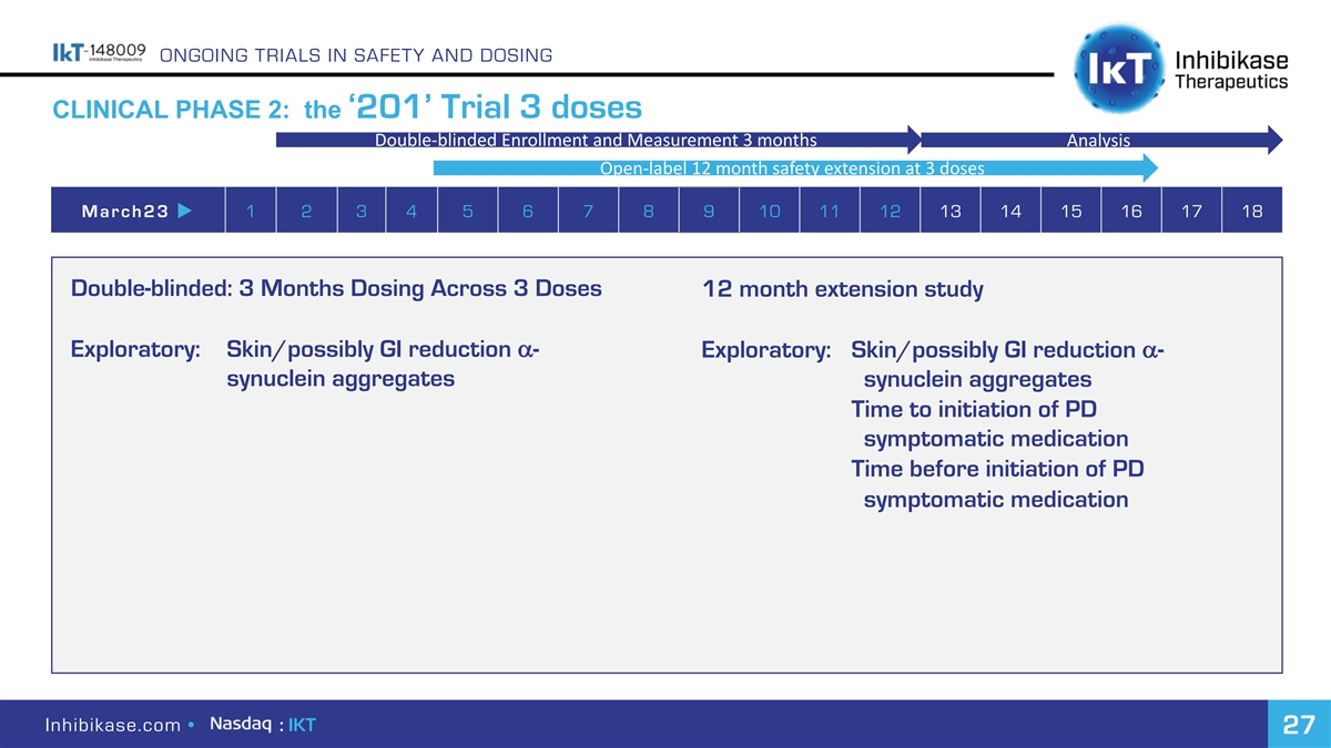 ONGOING TRIALS IN SAFETY AND DOSING CLINICAL PHASE 2: the ‘201’ Trial 3 doses Double-blinded Enrollment and Measurement 3 months Analysis Open-label 12 month safety extension at 3 doses March23 u 1 2 3 4 5 6 7 8 9 10 11 12 13 14 15 16 17 18 Double-blinded: 3 Months Dosing Across 3 Doses 12 month extension study Exploratory: Skin/possibly GI reduction a- Exploratory: Skin/possibly GI reduction a- synuclein aggregates synuclein aggregates Time to initiation of PD symptomatic medication Time before initiation of PD symptomatic medication Inhibikase.com • : IKT 27