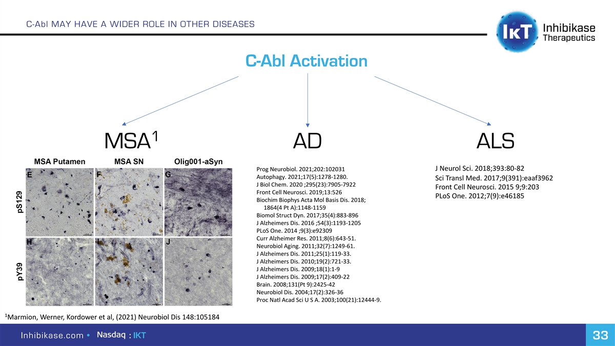 C-Abl MAY HAVE A WIDER ROLE IN OTHER DISEASES C-Abl Activation 1 MSA AD ALS Prog Neurobiol. 2021;202:102031 J Neurol Sci. 2018;393:80-82 Autophagy. 2021;17(5):1278-1280. Sci Transl Med. 2017;9(391):eaaf3962 J Biol Chem. 2020 ;295(23):7905-7922 Front Cell Neurosci. 2015 9;9:203 Front Cell Neurosci. 2019;13:526 PLoS One. 2012;7(9):e46185 Biochim Biophys Acta Mol Basis Dis. 2018; 1864(4 Pt A):1148-1159 Biomol Struct Dyn. 2017;35(4):883-896 J Alzheimers Dis. 2016 ;54(3):1193-1205 PLoS One. 2014 ;9(3):e92309 Curr Alzheimer Res. 2011;8(6):643-51. Neurobiol Aging. 2011;32(7):1249-61. J Alzheimers Dis. 2011;25(1):119-33. J Alzheimers Dis. 2010;19(2):721-33. J Alzheimers Dis. 2009;18(1):1-9 J Alzheimers Dis. 2009;17(2):409-22 Brain. 2008;131(Pt 9):2425-42 Neurobiol Dis. 2004;17(2):326-36 Proc Natl Acad Sci U S A. 2003;100(21):12444-9. 1 Marmion, Werner, Kordower et al, (2021) Neurobiol Dis 148:105184 Inhibikase.com • : IKT 33