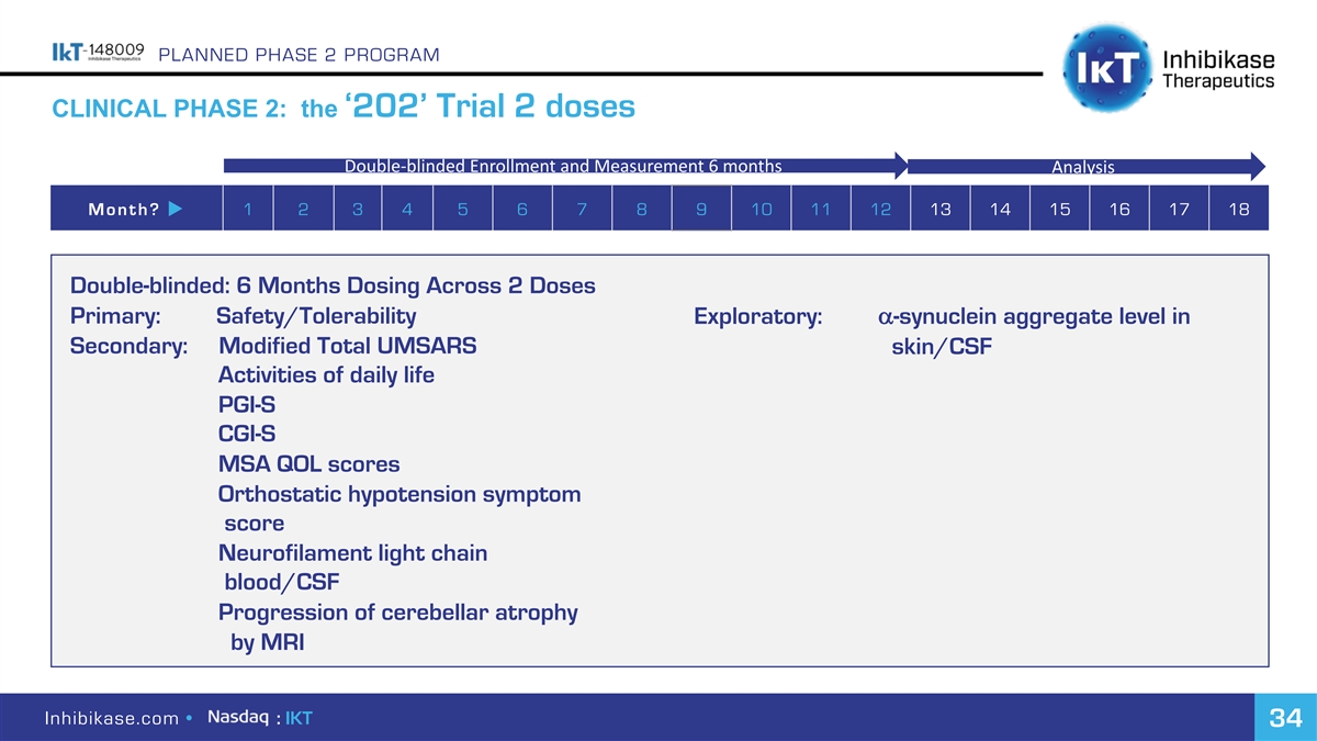 PLANNED PHASE 2 PROGRAM CLINICAL PHASE 2: the ‘202’ Trial 2 doses Double-blinded Enrollment and Measurement 6 months Analysis Month? u 1 2 3 4 5 6 7 8 9 10 11 12 13 14 15 16 17 18 Double-blinded: 6 Months Dosing Across 2 Doses Primary: Safety/Tolerability Exploratory: a-synuclein aggregate level in Secondary: Modified Total UMSARS skin/CSF Activities of daily life PGI-S CGI-S MSA QOL scores Orthostatic hypotension symptom score Neurofilament light chain blood/CSF Progression of cerebellar atrophy by MRI Inhibikase.com • : IKT 34