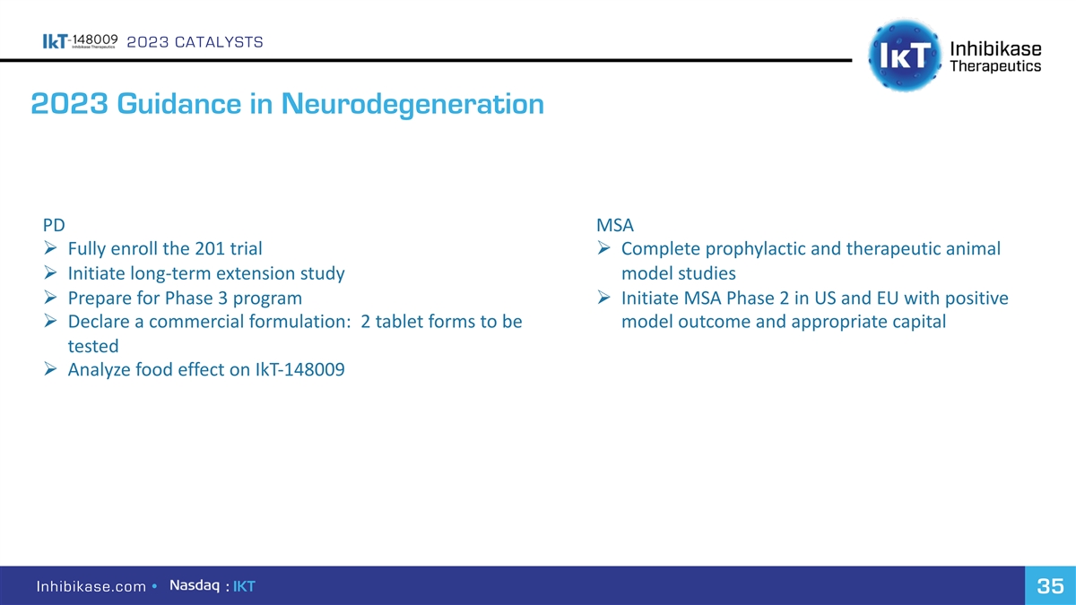2023 CATALYSTS 2023 Guidance in Neurodegeneration PD MSA Ø Fully enroll the 201 trial Ø Complete prophylactic and therapeutic animal Ø Initiate long-term extension study model studies Ø Prepare for Phase 3 program Ø Initiate MSA Phase 2 in US and EU with positive Ø Declare a commercial formulation: 2 tablet forms to be model outcome and appropriate capital tested Ø Analyze food effect on IkT-148009 Inhibikase.com • : IKT 35