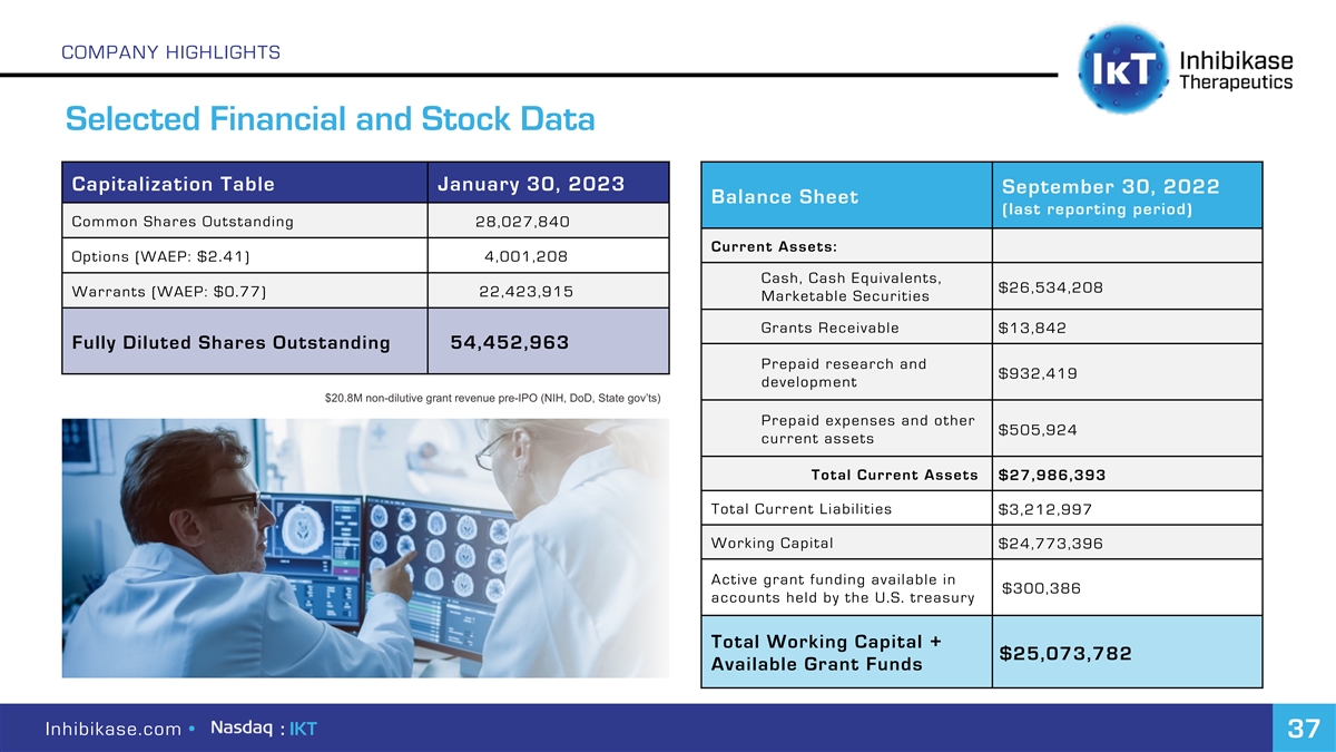COMPANY HIGHLIGHTS Selected Financial and Stock Data Capitalization Table January 30, 2023 September 30, 2022 Balance Sheet (last reporting period) Common Shares Outstanding 28,027,840 Current Assets: Options (WAEP: $2.41) 4,001,208 Cash, Cash Equivalents, $26,534,208 Warrants (WAEP: $0.77) 22,423,915 Marketable Securities Grants Receivable $13,842 Fully Diluted Shares Outstanding 54,452,963 Prepaid research and $932,419 development $20.8M non-dilutive grant revenue pre-IPO (NIH, DoD, State gov’ts) Prepaid expenses and other $505,924 current assets Total Current Assets $27,986,393 Total Current Liabilities $3,212,997 Working Capital $24,773,396 Active grant funding available in $300,386 accounts held by the U.S. treasury Total Working Capital + $25,073,782 Available Grant Funds Inhibikase.com • : IKT 37