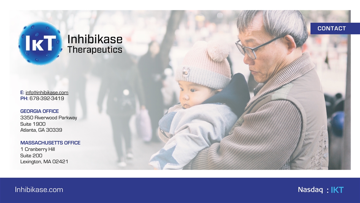 CONTACT E: info@inhibikase.com PH: 678-392-3419 GEORGIA OFFICE 3350 Riverwood Parkway Suite 1900 Atlanta, GA 30339 MASSACHUSETTS OFFICE 1 Cranberry Hill Suite 200 Lexington, MA 02421 Inhibikase.com : IKT