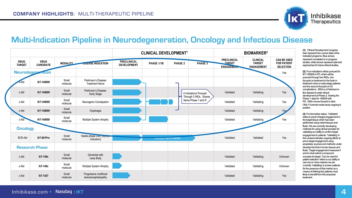 Agenda for the 2023 Neurodegeneration R&D Day • Why is c-Abl an important target in PD? • How was IkT-148009 discovered? • What is therapeutically possible with IkT-148009? • Clinical Development: Phase 2 and beyond in PD • Opening of MSA clinical development In Inh hiib biik ka as se e.c .co om m • • :: IK IKT T 3 3
