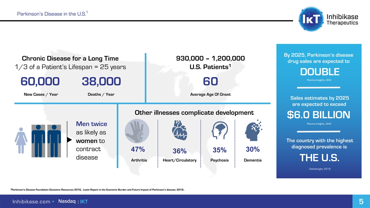 1 Parkinson’s Disease in the U.S. By 2025, Parkinson’s disease Chronic Disease for a Long Time 930,000 – 1,200,000 drug sales are expected to 1 1/3 of a Patient’s Lifespan = 25 years U.S. Patients DOUBLE Pharma Insights, 2019 60,000 38,000 60 New Cases / Year Deaths / Year Average Age Of Onset Sales estimates by 2025 are expected to exceed Other illnesses complicate development $6.0 BILLION Pharma Insights, 2019 Men twice as likely as The country with the highest women to diagnosed prevalence is contract 47% 30% 35% 36% disease THE U.S. Arthritis Heart/Circulatory Psychosis Dementia DelveInsight, 2019 1 Parkinson’s Disease Foundation Decisions Resources 2016, Lewin Report in the Economic Burden and Future Impact of Parkinson’s disease, 2019.. Inhibikase.com • : IKT 5