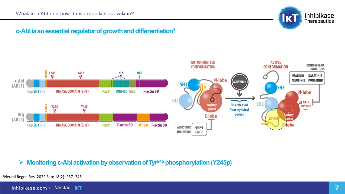 What is c-Abl and how do we monitor activation? 1 c-Abl is an essential regulator of growth and differentiation 245 Ø Monitoring c-Abl activation by observation of Tyr phosphorylation (Y245p) 1 Neural Regen Res. 2022 Feb; 18(2): 237–243 Inhibikase.com • : IKT 7
