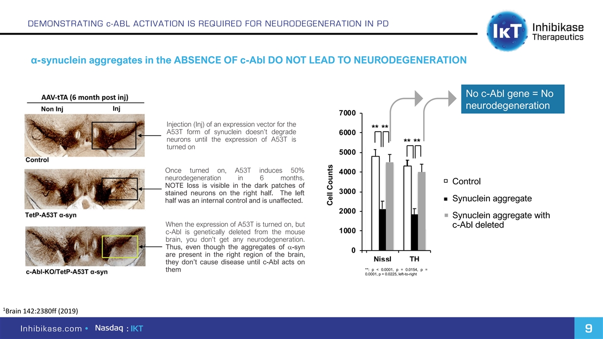 DEMONSTRATING c-ABL ACTIVATION IS REQUIRED FOR NEURODEGENERATION IN PD α-synuclein aggregates in the ABSENCE OF c-Abl DO NOT LEAD TO NEURODEGENERATION No c-Abl gene = No neurodegeneration Injection (Inj) of an expression vector for the A53T form of synuclein doesn’t degrade neurons until the expression of A53T is turned on Once turned on, A53T induces 50% neurodegeneration in 6 months. Control NOTE loss is visible in the dark patches of stained neurons on the right half. The left Synuclein aggregate half was an internal control and is unaffected. Synuclein aggregate with When the expression of A53T is turned on, but c-Abl deleted c-Abl is genetically deleted from the mouse brain, you don’t get any neurodegeneration. Thus, even though the aggregates of a-syn are present in the right region of the brain, they don’t cause disease until c-Abl acts on **: p < 0.0001, p = 0.0154, p = them 0.0001, p = 0.0225, left-to-right 1 Brain 142:2380ff (2019) Inhibikase.com • : IKT 9