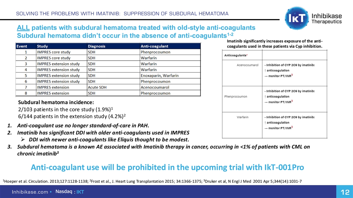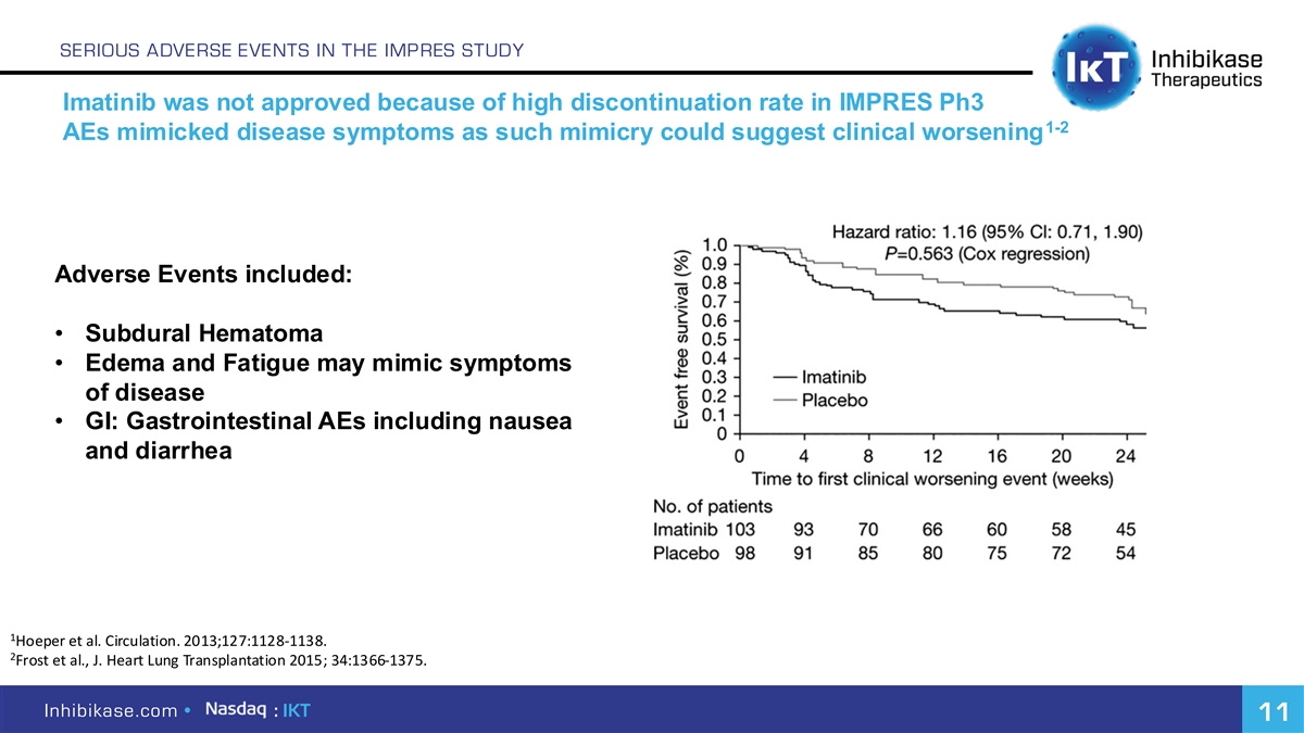 SERIOUS ADVERSE EVENTS IN THE IMPRES STUDY Imatinib was not approved because of high discontinuation rate in IMPRES Ph3 1-2 AEs mimicked disease symptoms as such mimicry could suggest clinical worsening Adverse Events included: • Subdural Hematoma • Edema and Fatigue may mimic symptoms of disease • GI: Gastrointestinal AEs including nausea and diarrhea 1 Hoeper et al. Circulation. 2013;127:1128-1138. 2 Frost et al., J. Heart Lung Transplantation 2015; 34:1366-1375. Inhibikase.com • : IKT 11