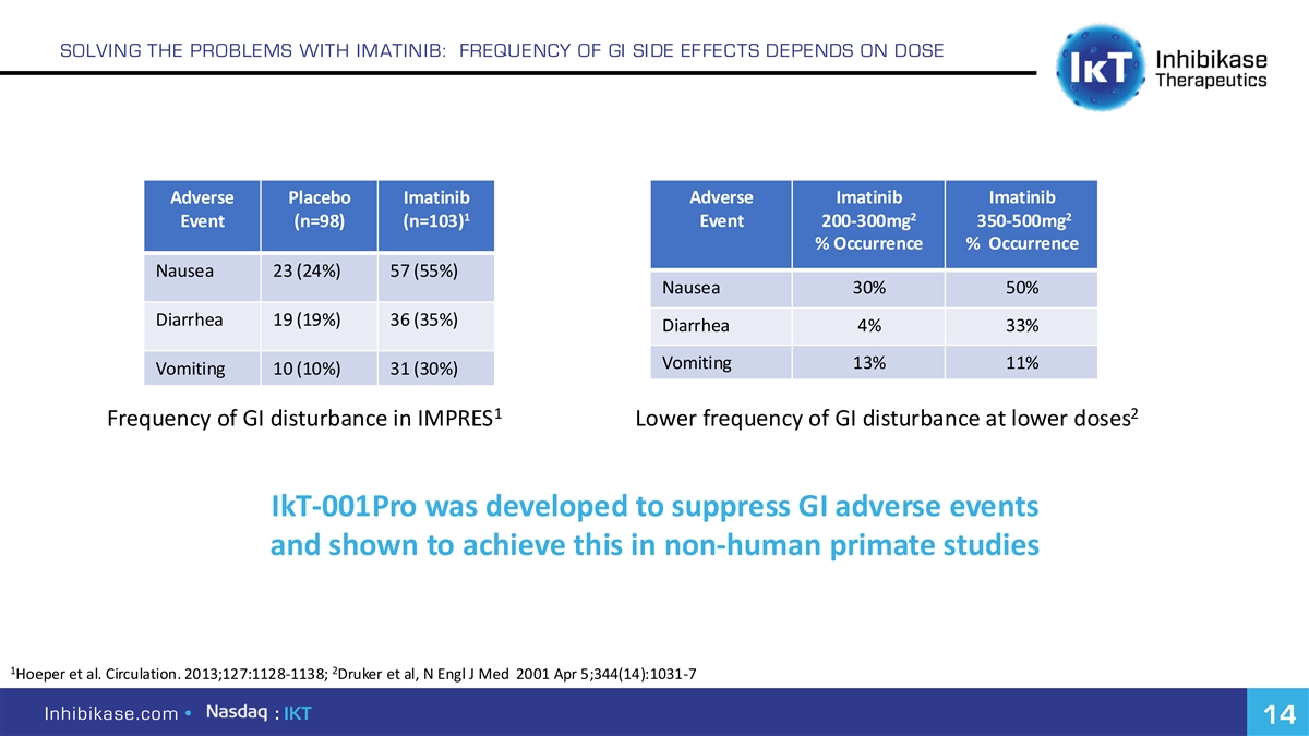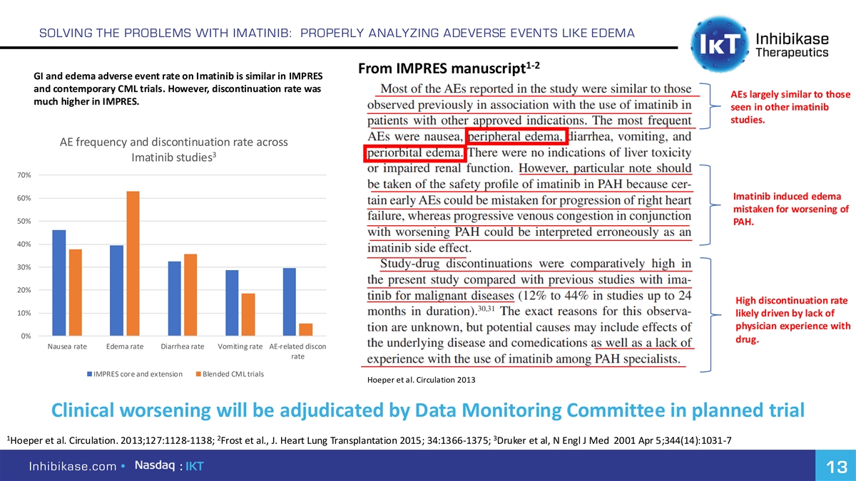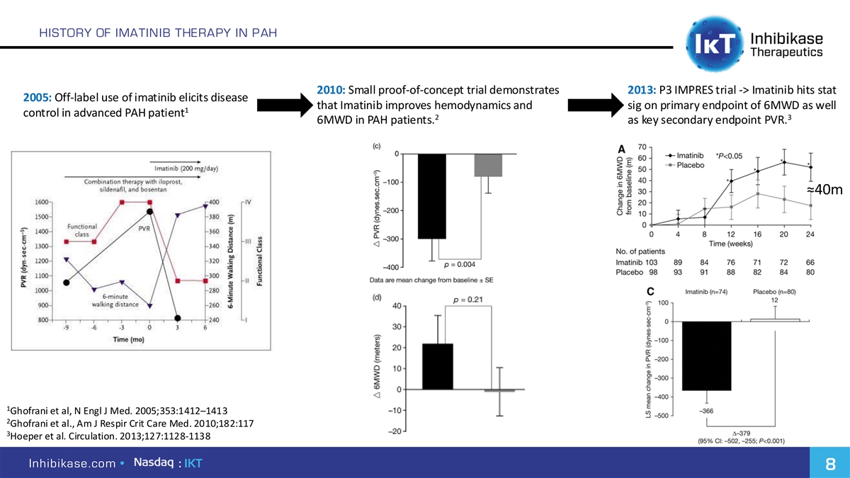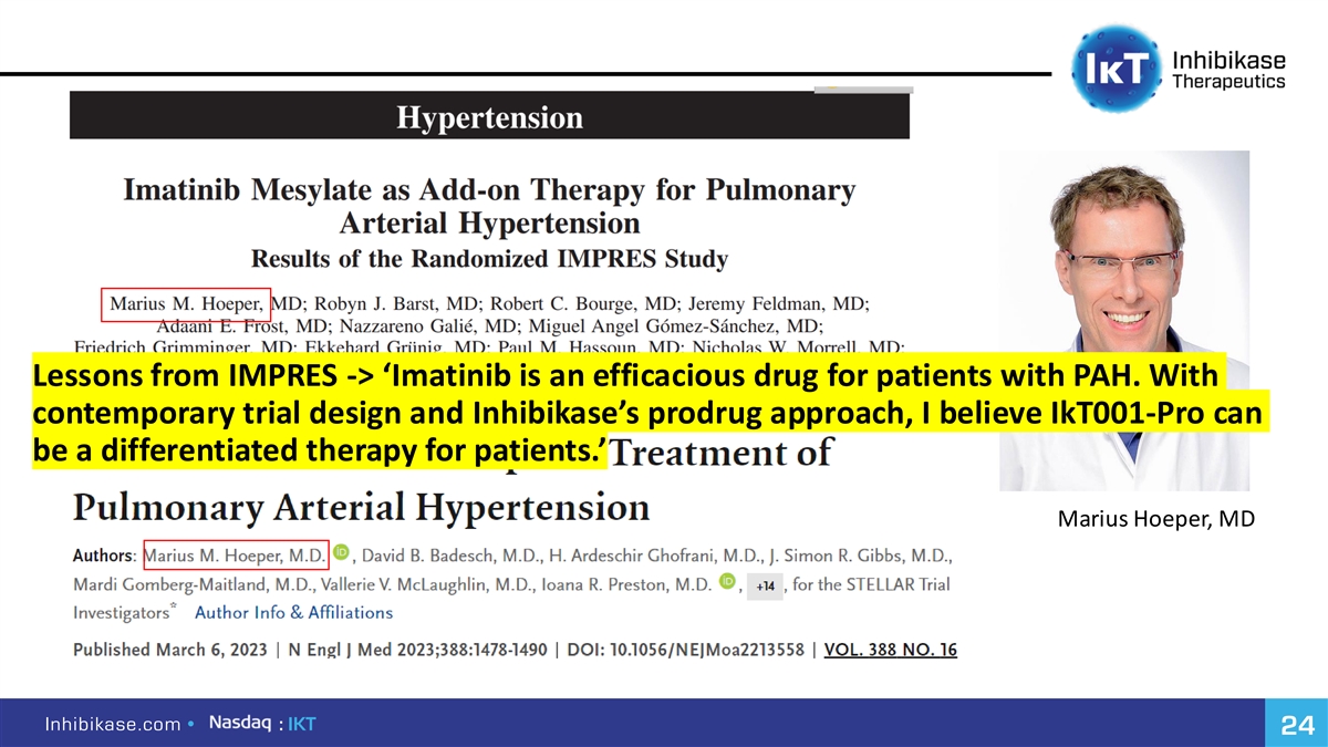 Lessons from IMPRES -> ‘Imatinib is an efficacious drug for patients with PAH. With contemporary trial design and Inhibikase’s prodrug approach, I believe IkT001-Pro can be a differentiated therapy for patients.’ Marius Hoeper, MD Inhibikase.com • : IKT 24