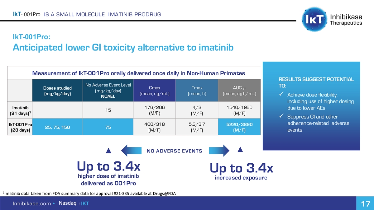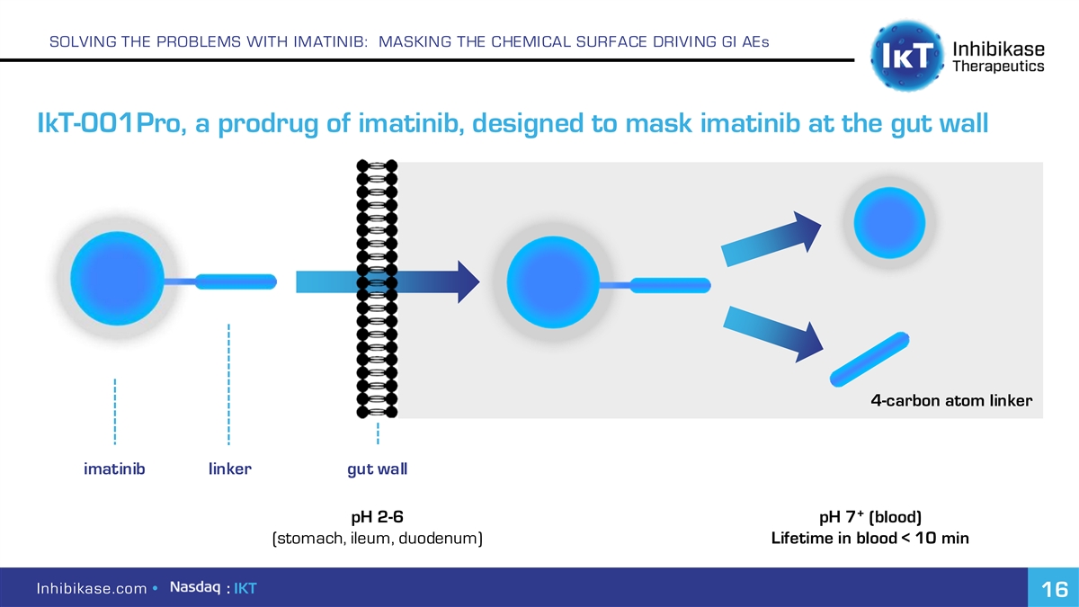 SOLVING THE PROBLEMS WITH IMATINIB: MASKING THE CHEMICAL SURFACE DRIVING GI AEs IkT-001Pro, a prodrug of imatinib, designed to mask imatinib at the gut wall 4-carbon atom linker imatinib linker gut wall + pH 2-6 pH 7 (blood) (stomach, ileum, duodenum) Lifetime in blood < 10 min Inhibikase.com • : IKT 16