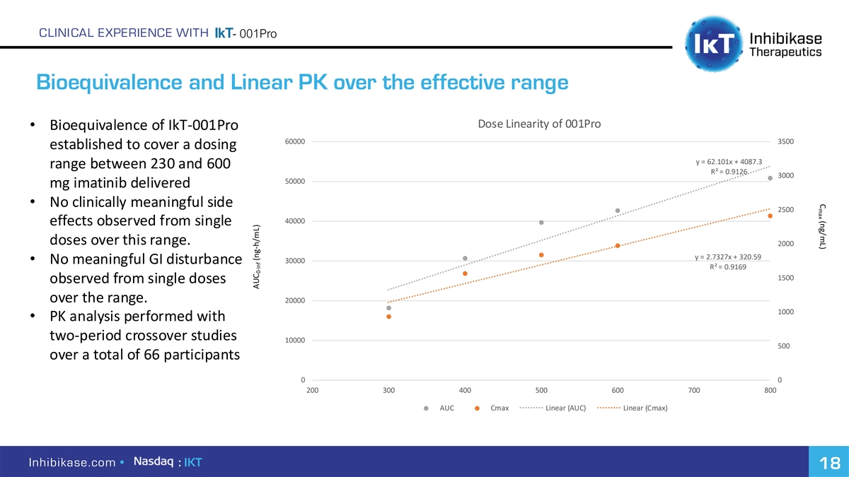 C (ng/mL) max CLINICAL EXPERIENCE WITH IkT- 001Pro Bioequivalence and Linear PK over the effective range Dose Linearity of 001Pro • Bioequivalence of IkT-001Pro 60000 3500 established to cover a dosing y = 62.101x + 4087.3 range between 230 and 600 R² = 0.9126 3000 50000 mg imatinib delivered • No clinically meaningful side 2500 40000 effects observed from single doses over this range. 2000 y = 2.7327x + 320.59 30000 • No meaningful GI disturbance R² = 0.9169 1500 observed from single doses over the range. 20000 1000 • PK analysis performed with two-period crossover studies 10000 500 over a total of 66 participants 0 0 200 300 400 500 600 700 800 AUC Cmax Linear (AUC) Linear (Cmax) Inhibikase.com • : IKT 18 AUC (ng-h/mL) 0-inf
