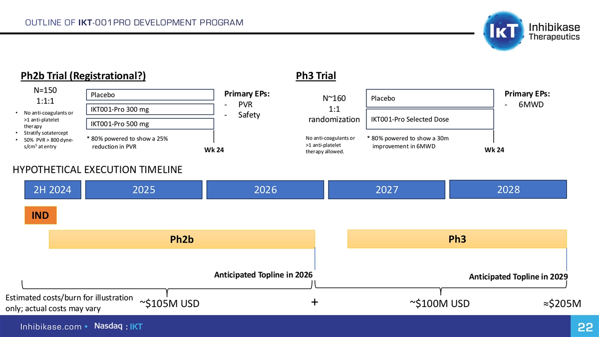 OUTLINE OF IKT-001PRO DEVELOPMENT PROGRAM Ph2b Trial (Registrational?) Ph3 Trial N=150 Primary EPs: Primary EPs: Placebo Placebo N~160 1:1:1 - PVR - 6MWD IKT001-Pro 300 mg 1:1 • No anti-coagulants or - Safety >1 anti-platelet IKT001-Pro Selected Dose randomization IKT001-Pro 500 mg therapy • Stratify sotatercept No anti-coagulants or * 80% powered to show a 30m * 80% powered to show a 25% • 50% PVR > 800 dyne- 5 >1 anti-platelet s/cm at entry reduction in PVR improvement in 6MWD Wk 24 Wk 24 therapy allowed. HYPOTHETICAL EXECUTION TIMELINE 2H 2024 2025 2026 2027 2028 IND Ph2b Ph3 Anticipated Topline in 2026 Anticipated Topline in 2029 Estimated costs/burn for illustration + ~$105M USD ~$100M USD ≈$205M only; actual costs may vary Inhibikase.com • : IKT 22