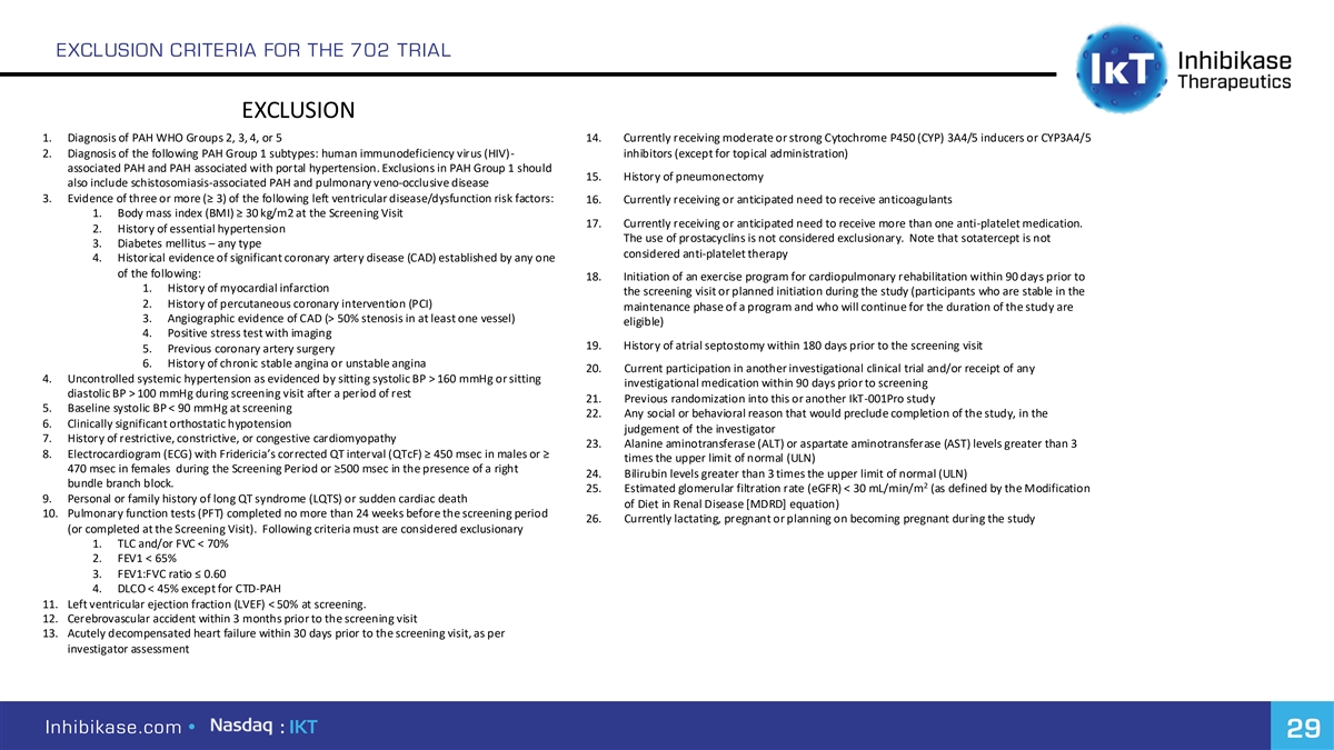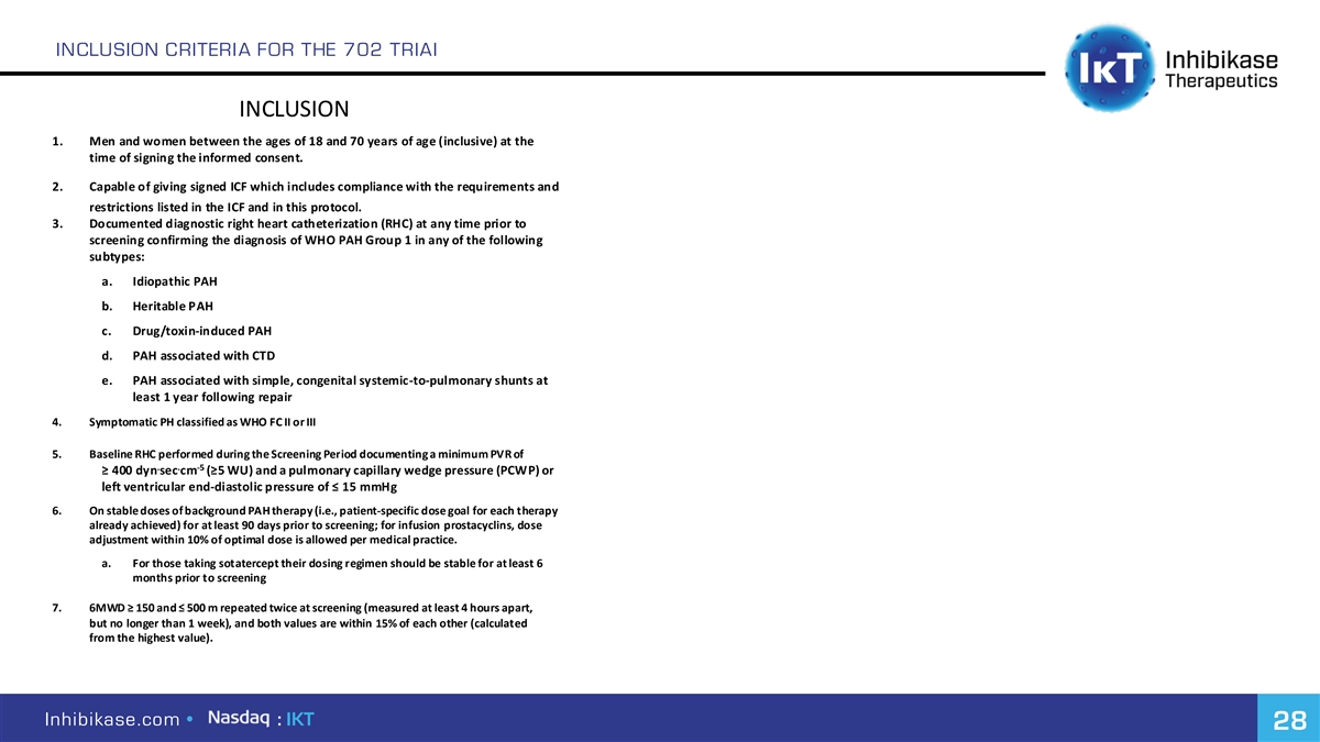 INCLUSION CRITERIA FOR THE 702 TRIAl INCLUSION 1. Men and women between the ages of 18 and 70 years of age (inclusive) at the time of signing the informed consent. 2. Capable of giving signed ICF which includes compliance with the requirements and restrictions listed in the ICF and in this protocol. 3. Documented diagnostic right heart catheterization (RHC) at any time prior to screening confirming the diagnosis of WHO PAH Group 1 in any of the following subtypes: a. Idiopathic PAH b. Heritable PAH c. Drug/toxin-induced PAH d. PAH associated with CTD e. PAH associated with simple, congenital systemic-to-pulmonary shunts at least 1 year following repair 4. Symptomatic PH classified as WHO FC II or III 5. Baseline RHC performed during the Screening Period documenting a minimum PVR of . . -5 ≥ 400 dyn sec cm (≥5 WU) and a pulmonary capillary wedge pressure (PCWP) or left ventricular end-diastolic pressure of ≤ 15 mmHg 6. On stable doses of background PAH therapy (i.e., patient-specific dose goal for each therapy already achieved) for at least 90 days prior to screening; for infusion prostacyclins, dose adjustment within 10% of optimal dose is allowed per medical practice. a. For those taking sotatercept their dosing regimen should be stable for at least 6 months prior to screening 7. 6MWD ≥ 150 and ≤ 500 m repeated twice at screening (measured at least 4 hours apart, but no longer than 1 week), and both values are within 15% of each other (calculated from the highest value). Inhibikase.com • : IKT 28