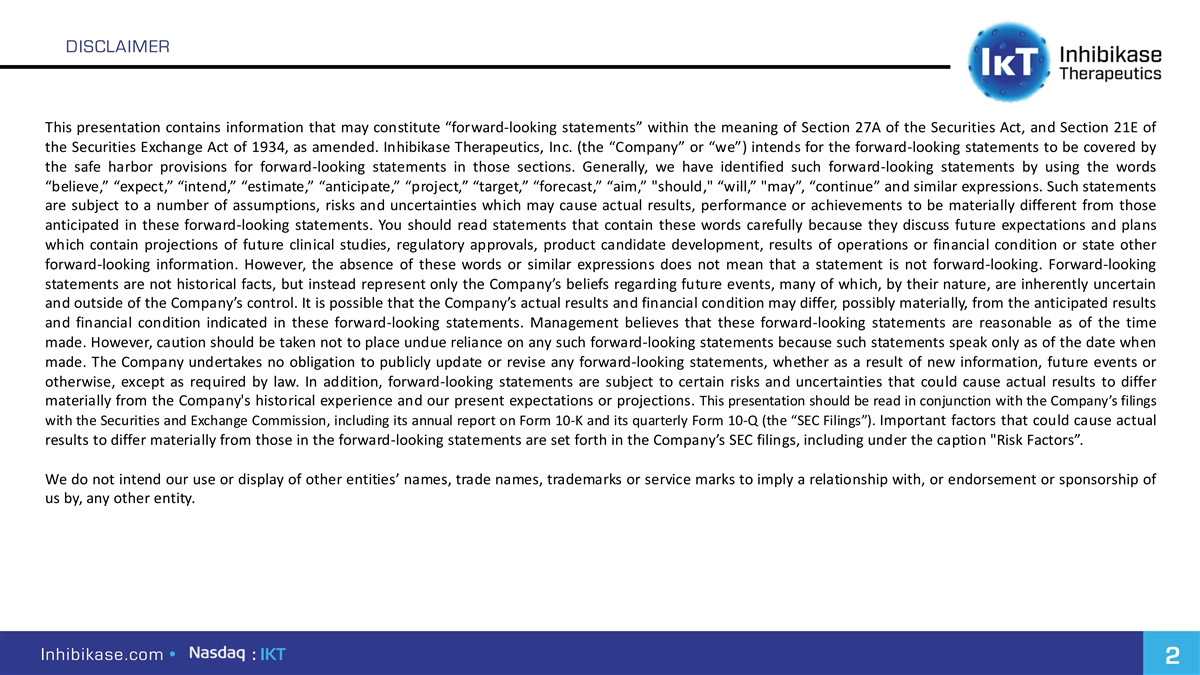 DISCLAIMER This presentation contains information that may constitute “forward-looking statements” within the meaning of Section 27A of the Securities Act, and Section 21E of the Securities Exchange Act of 1934, as amended. Inhibikase Therapeutics, Inc. (the “Company” or “we”) intends for the forward-looking statements to be covered by the safe harbor provisions for forward-looking statements in those sections. Generally, we have identified such forward-looking statements by using the words “believe,” “expect,” “intend,” “estimate,” “anticipate,” “project,” “target,” “forecast,” “aim,” should, “will,” may”, “continue” and similar expressions. Such statements are subject to a number of assumptions, risks and uncertainties which may cause actual results, performance or achievements to be materially different from those anticipated in these forward-looking statements. You should read statements that contain these words carefully because they discuss future expectations and plans which contain projections of future clinical studies, regulatory approvals, product candidate development, results of operations or financial condition or state other forward-looking information. However, the absence of these words or similar expressions does not mean that a statement is not forward-looking. Forward-looking statements are not historical facts, but instead represent only the Company’s beliefs regarding future events, many of which, by their nature, are inherently uncertain and outside of the Company’s control. It is possible that the Company’s actual results and financial condition may differ, possibly materially, from the anticipated results and financial condition indicated in these forward-looking statements. Management believes that these forward-looking statements are reasonable as of the time made. However, caution should be taken not to place undue reliance on any such forward-looking statements because such statements speak only as of the date when made. The Company undertakes no obligation to publicly update or revise any forward-looking statements, whether as a result of new information, future events or otherwise, except as required by law. In addition, forward-looking statements are subject to certain risks and uncertainties that could cause actual results to differ materially from the Company's historical experience and our present expectations or projections. This presentation should be read in conjunction with the Company’s filings with the Securities and Exchange Commission, including its annual report on Form 10-K and its quarterly Form 10-Q (the “SEC Filings”). Important factors that could cause actual results to differ materially from those in the forward-looking statements are set forth in the Company’s SEC filings, including under the caption Risk Factors”. We do not intend our use or display of other entities’ names, trade names, trademarks or service marks to imply a relationship with, or endorsement or sponsorship of us by, any other entity. Inhibikase.com • : IKT 2