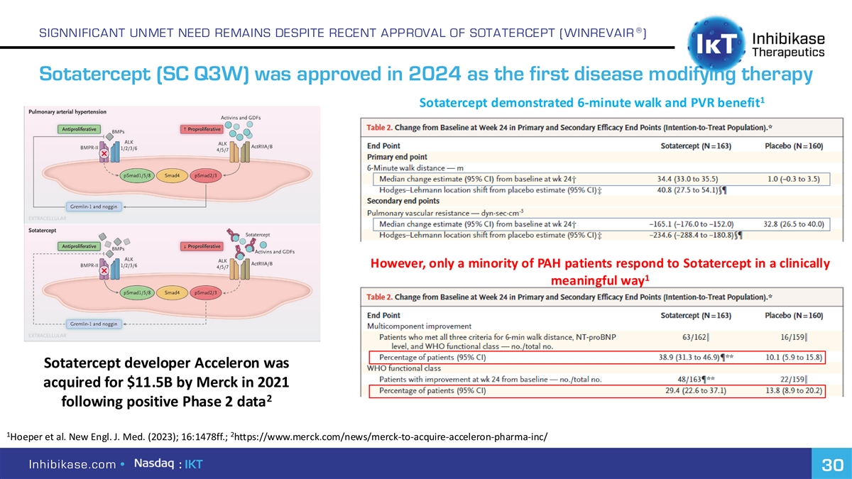 ® SIGNNIFICANT UNMET NEED REMAINS DESPITE RECENT APPROVAL OF SOTATERCEPT (WINREVAIR ) Sotatercept (SC Q3W) was approved in 2024 as the first disease modifying therapy 1 Sotatercept demonstrated 6-minute walk and PVR benefit However, only a minority of PAH patients respond to Sotatercept in a clinically 1 meaningful way Sotatercept developer Acceleron was acquired for $11.5B by Merck in 2021 2 following positive Phase 2 data 1 2 Hoeper et al. New Engl. J. Med. (2023); 16:1478ff.; https://www.merck.com/news/merck-to-acquire-acceleron-pharma-inc/ Inhibikase.com • : IKT 30