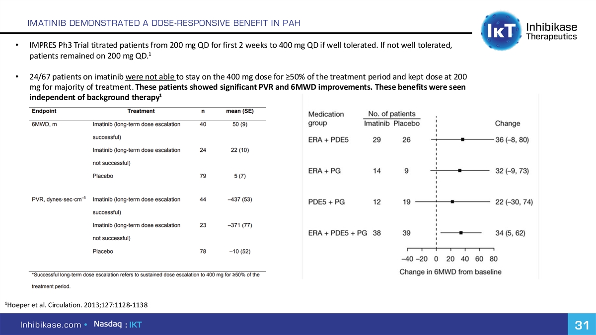 IMATINIB DEMONSTRATED A DOSE-RESPONSIVE BENEFIT IN PAH • IMPRES Ph3 Trial titrated patients from 200 mg QD for first 2 weeks to 400 mg QD if well tolerated. If not well tolerated, 1 patients remained on 200 mg QD. • 24/67 patients on imatinib were not able to stay on the 400 mg dose for ≥50% of the treatment period and kept dose at 200 mg for majority of treatment. These patients showed significant PVR and 6MWD improvements. These benefits were seen 1 independent of background therapy 1 Hoeper et al. Circulation. 2013;127:1128-1138 Inhibikase.com • : IKT 31