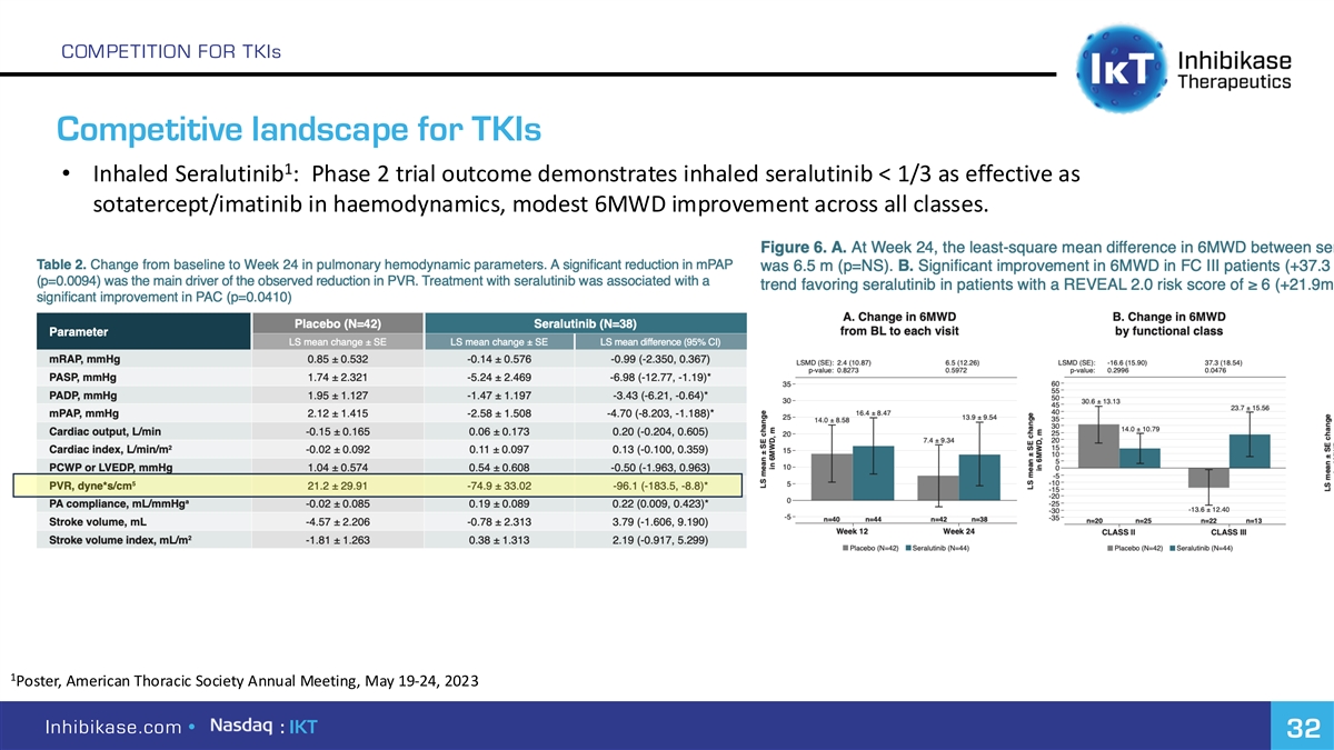 COMPETITION FOR TKIs Competitive landscape for TKIs 1 • Inhaled Seralutinib : Phase 2 trial outcome demonstrates inhaled seralutinib < 1/3 as effective as sotatercept/imatinib in haemodynamics, modest 6MWD improvement across all classes. 1 Poster, American Thoracic Society Annual Meeting, May 19-24, 2023 Inhibikase.com • : IKT 32