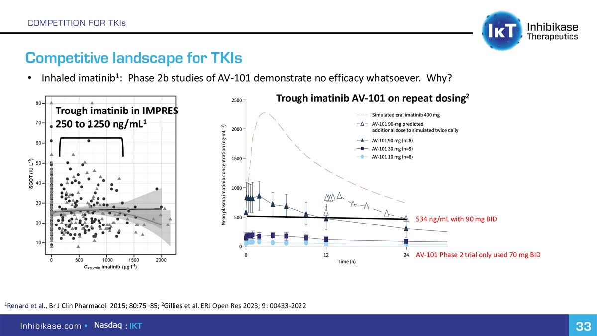 COMPETITION FOR TKIs Competitive landscape for TKIs 1 • Inhaled imatinib : Phase 2b studies of AV-101 demonstrate no efficacy whatsoever. Why? 2 Trough imatinib AV-101 on repeat dosing Trough imatinib in IMPRES 1 250 to 1250 ng/mL 534 ng/mL with 90 mg BID AV-101 Phase 2 trial only used 70 mg BID 1 2 Renard et al., Br J Clin Pharmacol 2015; 80:75–85; Gillies et al. ERJ Open Res 2023; 9: 00433-2022 Inhibikase.com • : IKT 33