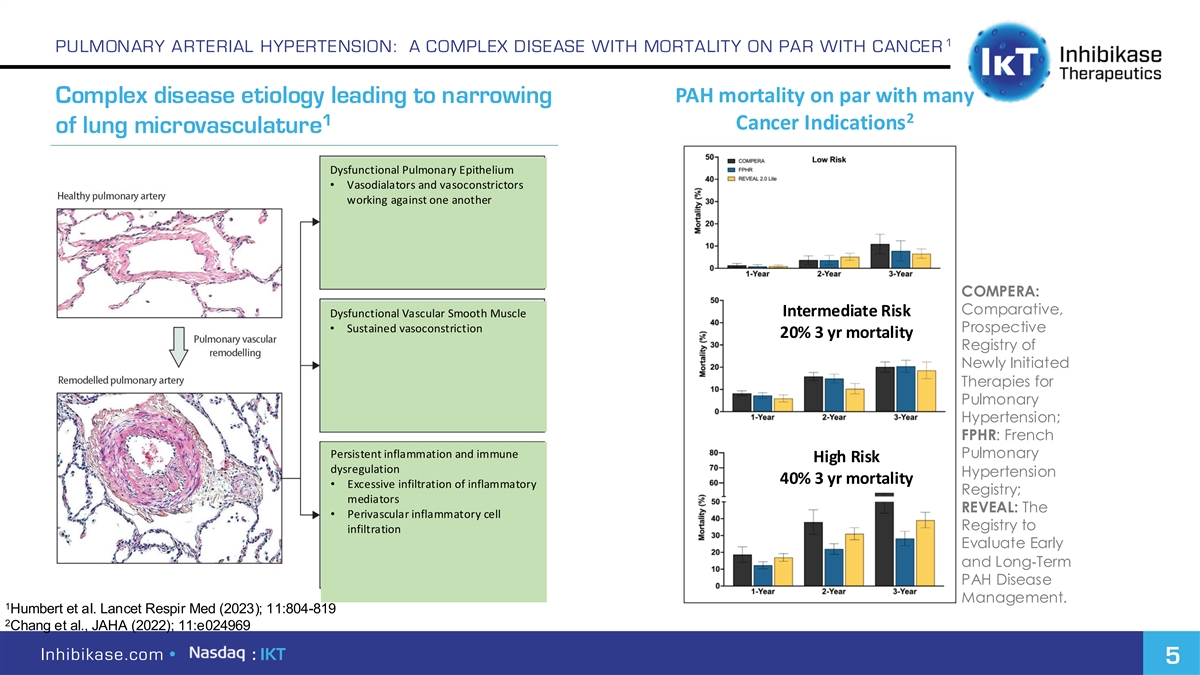 1 PULMONARY ARTERIAL HYPERTENSION: A COMPLEX DISEASE WITH MORTALITY ON PAR WITH CANCER PAH mortality on par with many Complex disease etiology leading to narrowing 2 1 Cancer Indications of lung microvasculature Dysfunctional Pulmonary Epithelium • Vasodialators and vasoconstrictors working against one another COMPERA: Comparative, Intermediate Risk Dysfunctional Vascular Smooth Muscle • Sustained vasoconstriction Prospective 20% 3 yr mortality Registry of Newly Initiated Therapies for Pulmonary Hypertension; FPHR: French Persistent inflammation and immune Pulmonary High Risk dysregulation Hypertension 40% 3 yr mortality • Excessive infiltration of inflammatory Registry; mediators REVEAL: The • Perivascular inflammatory cell Registry to infiltration Evaluate Early and Long‐Term PAH Disease Management. 1 Humbert et al. Lancet Respir Med (2023); 11:804-819 2 Chang et al., JAHA (2022); 11:e024969 Inhibikase.com • : IKT 5